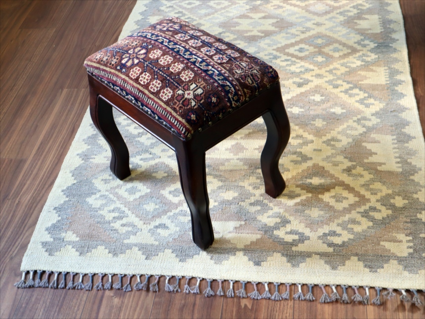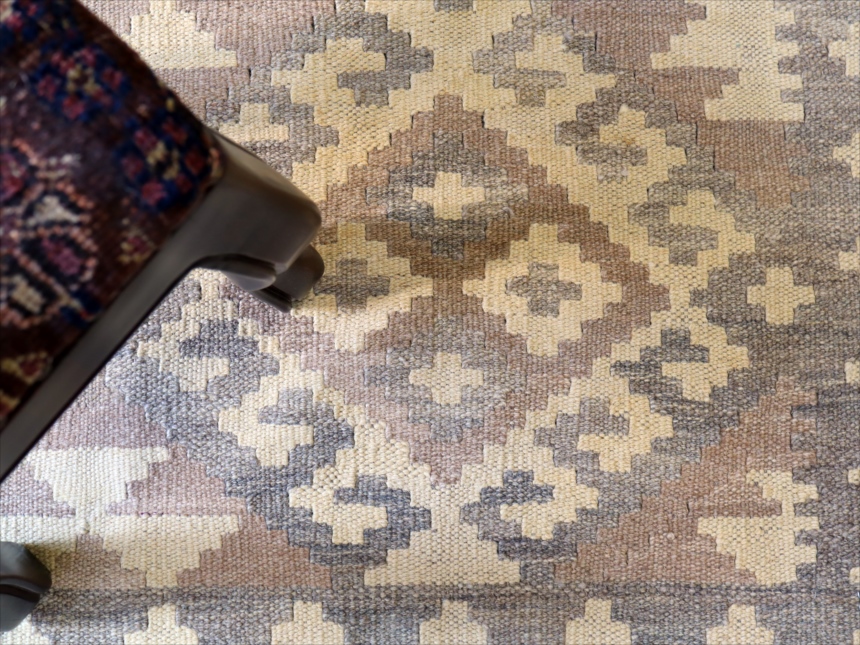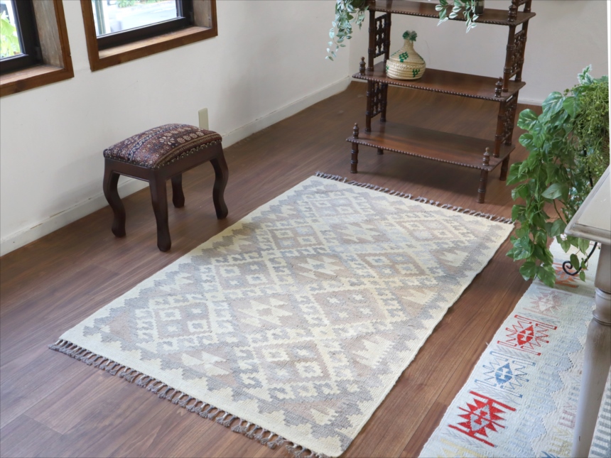 平織りのキリムとしては、がっしりとした厚みのある素朴な織りで、めくれにくくフロアに敷いても頼りない感じではなく、実用的です。表面はややザラっとした手触りです。