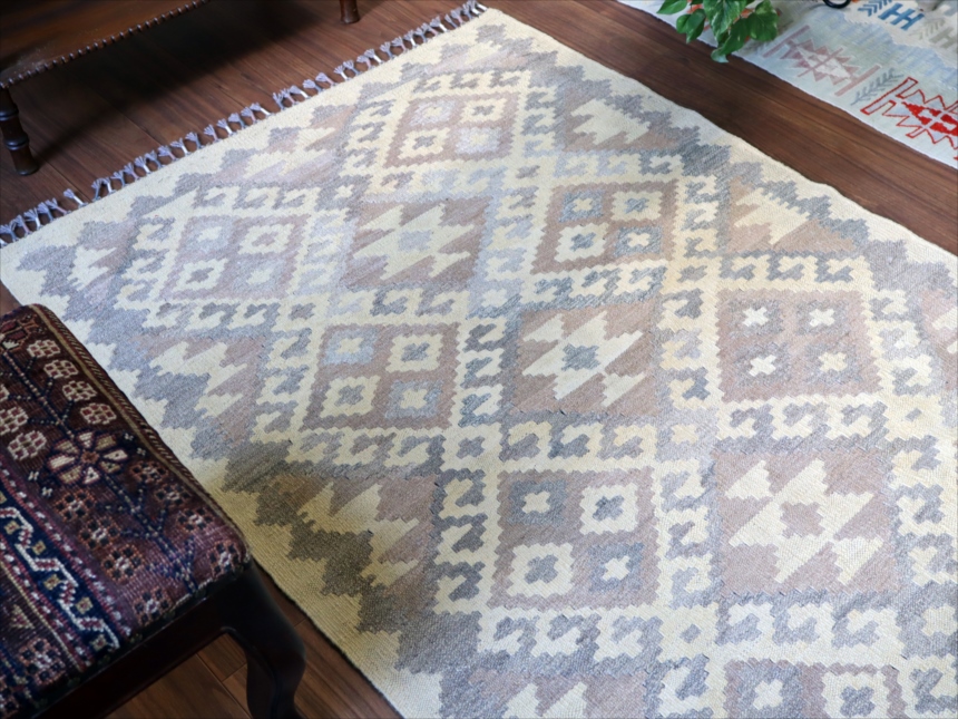 key:Kilim, Tribal rug, handmade, Persia, Quashkai, Nomad, Wool, キリム, トライバルラグ, ペルシャキリム, 手織り, ウール モノトーン シンプル ベージュ グレー 幾何学柄