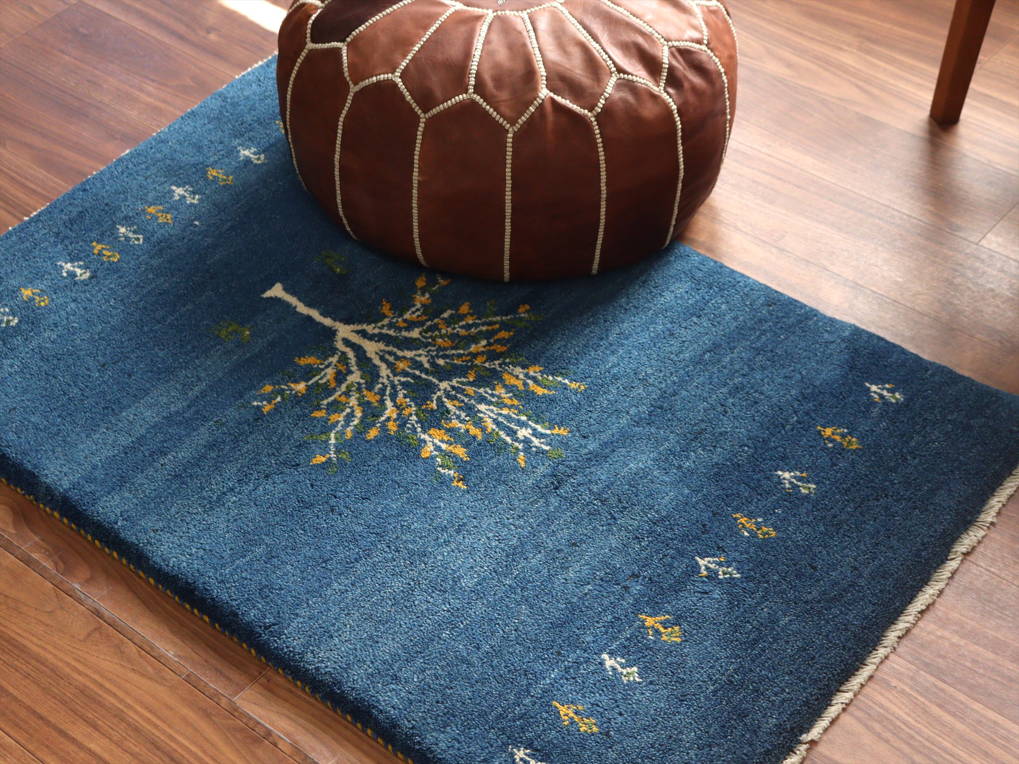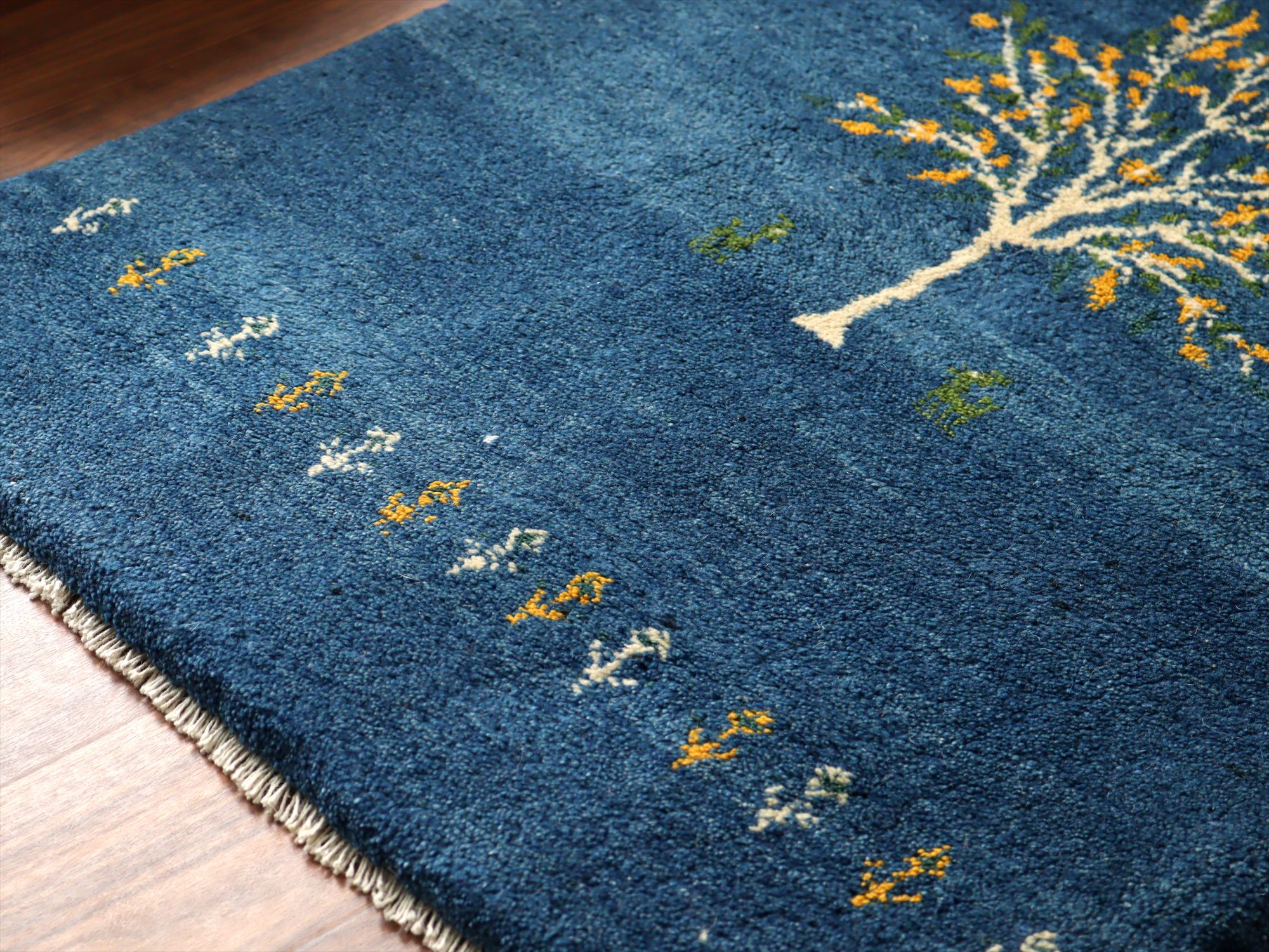 - イランの手織りラグ ギャッベ 120x80cm 植物と動物 ブルー