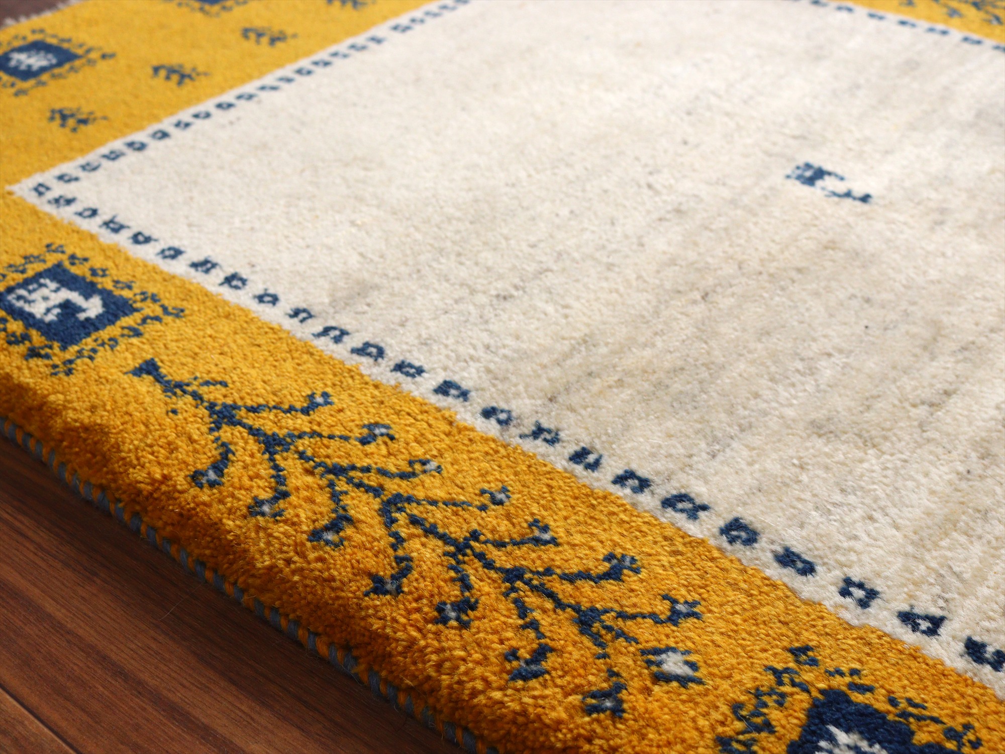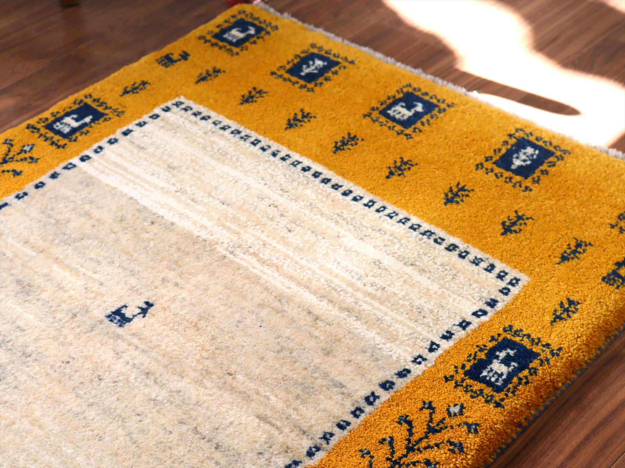 アイボリーとイエローをメインとした色使いで織られたギャッベ。中央は染めていない羊毛ベースに羊が1匹とシンプルですが、そこを取り囲むように織られているデザインの一部が欠けてしまっているのがユニークです。外側にはネイビーで動物や植物のタイル、生命の樹など明るいイエローに映えるように落とし込まれていてかわいらしいです。