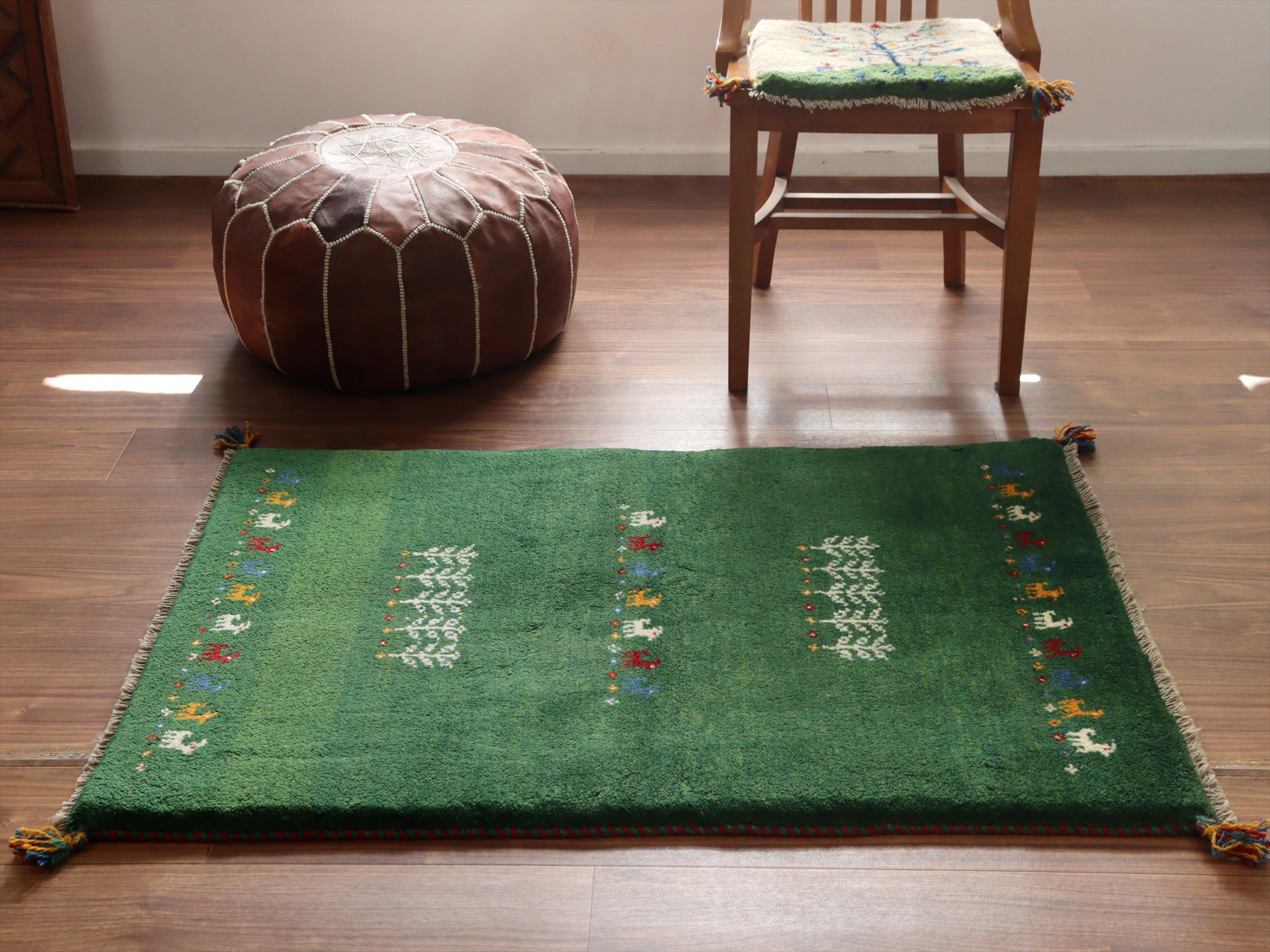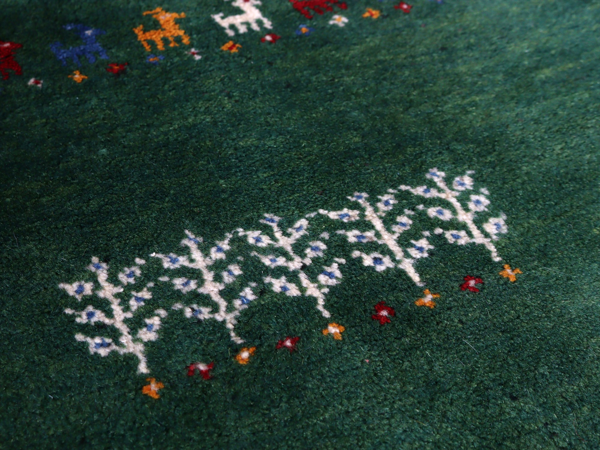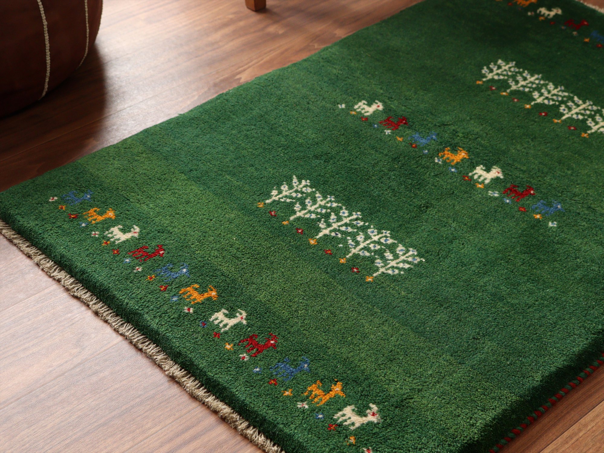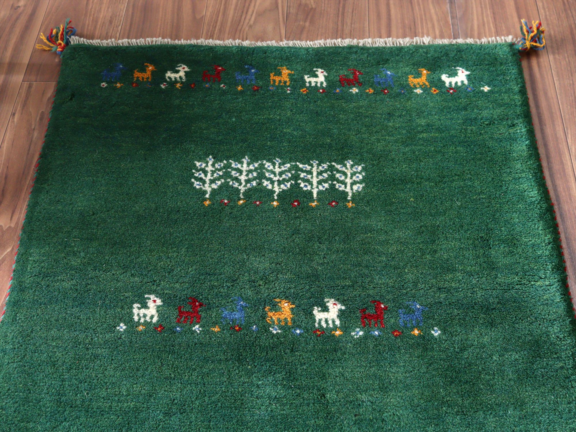 - イランの手織りラグ ギャッベ 114x81cm グリーン 動物と生命の樹