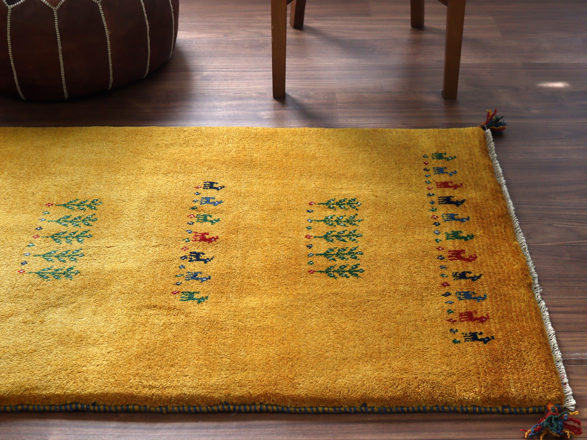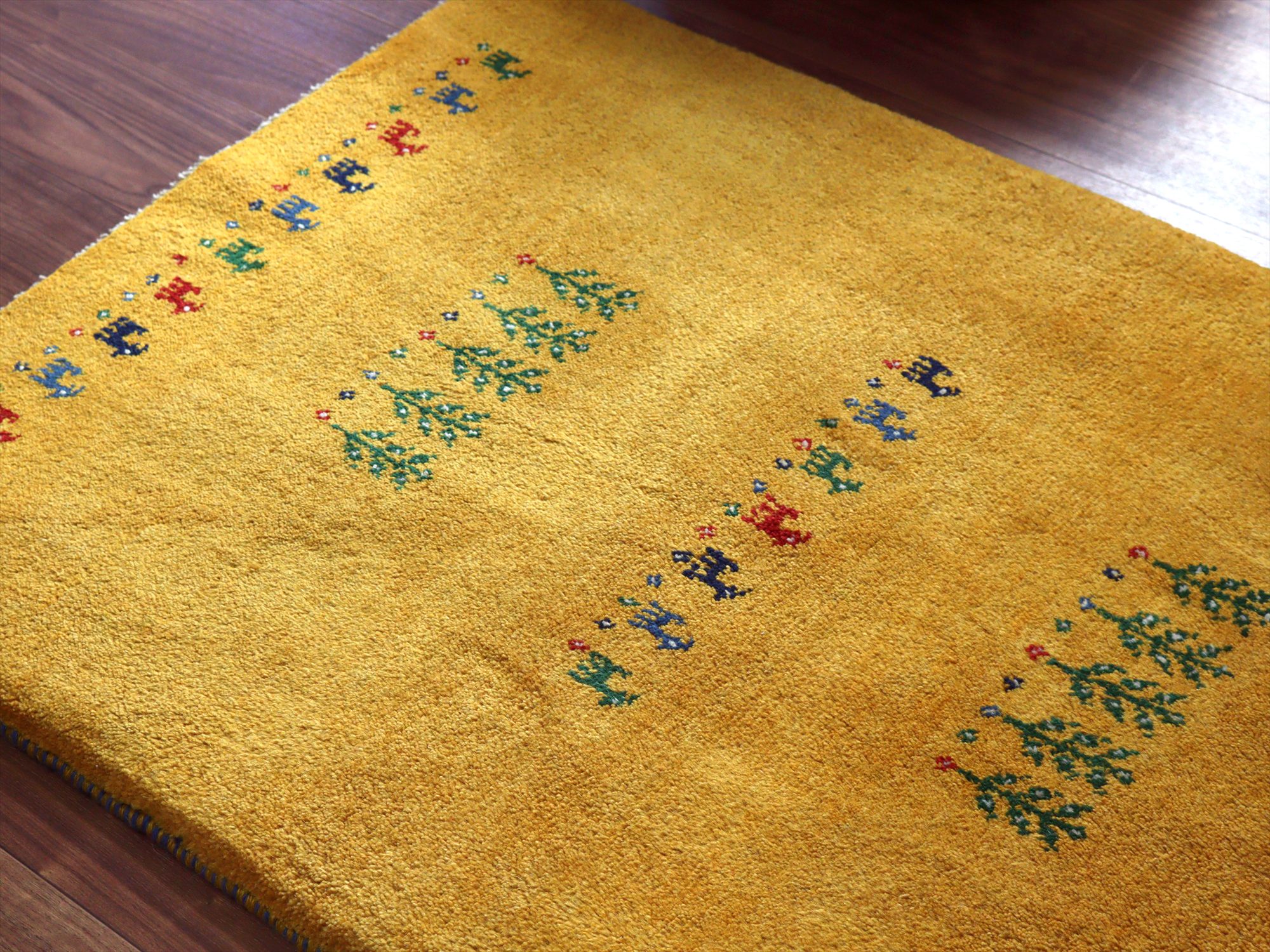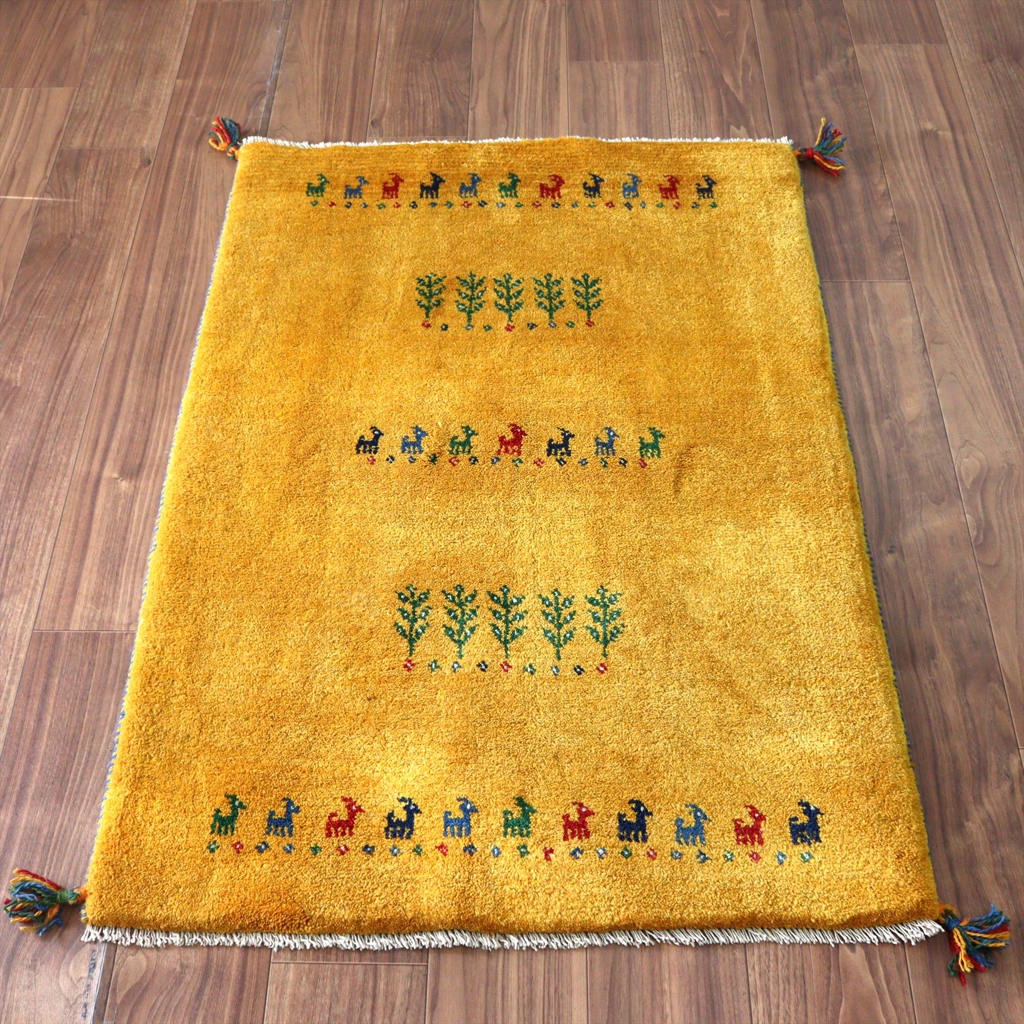 ギャッベ イランの手織りラグ 116x84cm 動物と生命の樹 イエロー