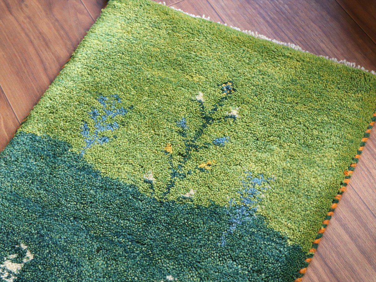 Key:Gabbeh, Tribal rug, Shiraz, Fars, Iran, Persia, Wool, ギャッベ, ギャベ, グリーン 緑 天然染料 草木染 ラグ, 絨毯, イラン, シラーズ, ペルシャ, バザールギャッベ, ポンポン, 手織り, 一点もの, 玄関マット, ふかふか, ガラタバザール