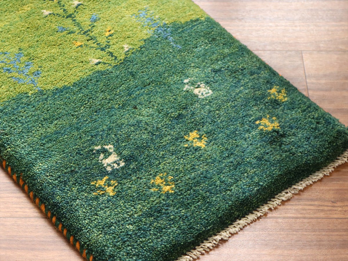 - ギャッベ ミニギャベ イラン手織り 57×39cm グリーン 丘の上に動物と生命の樹