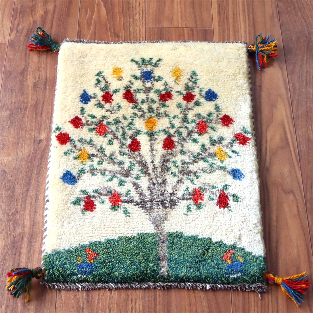 ギャッベ ミニギャベ イラン手織り 53×41cm ナチュラルアイボリー 生命の樹とザクロと動物