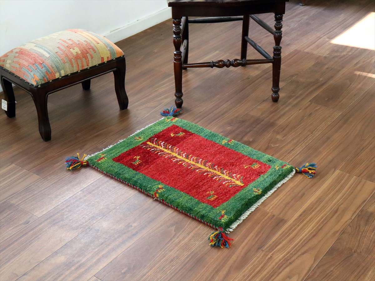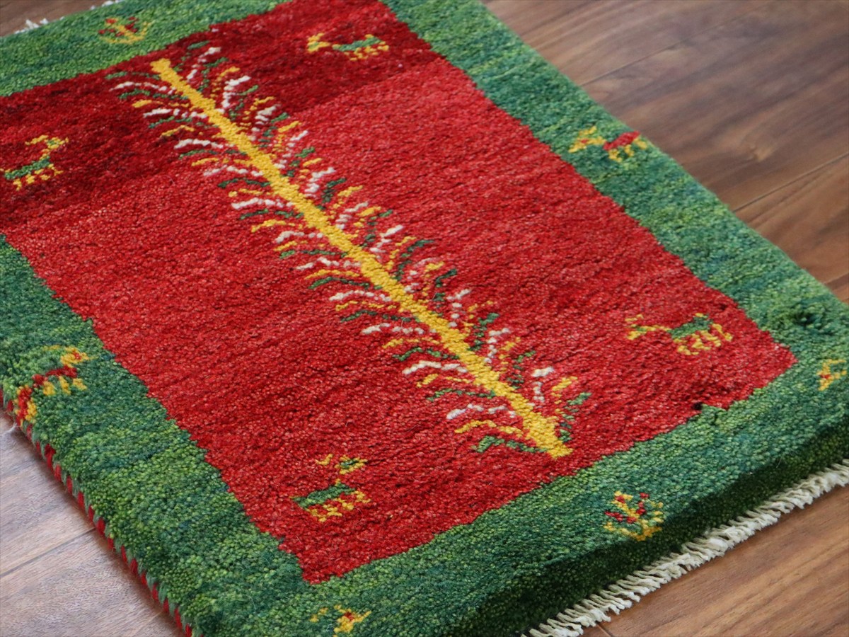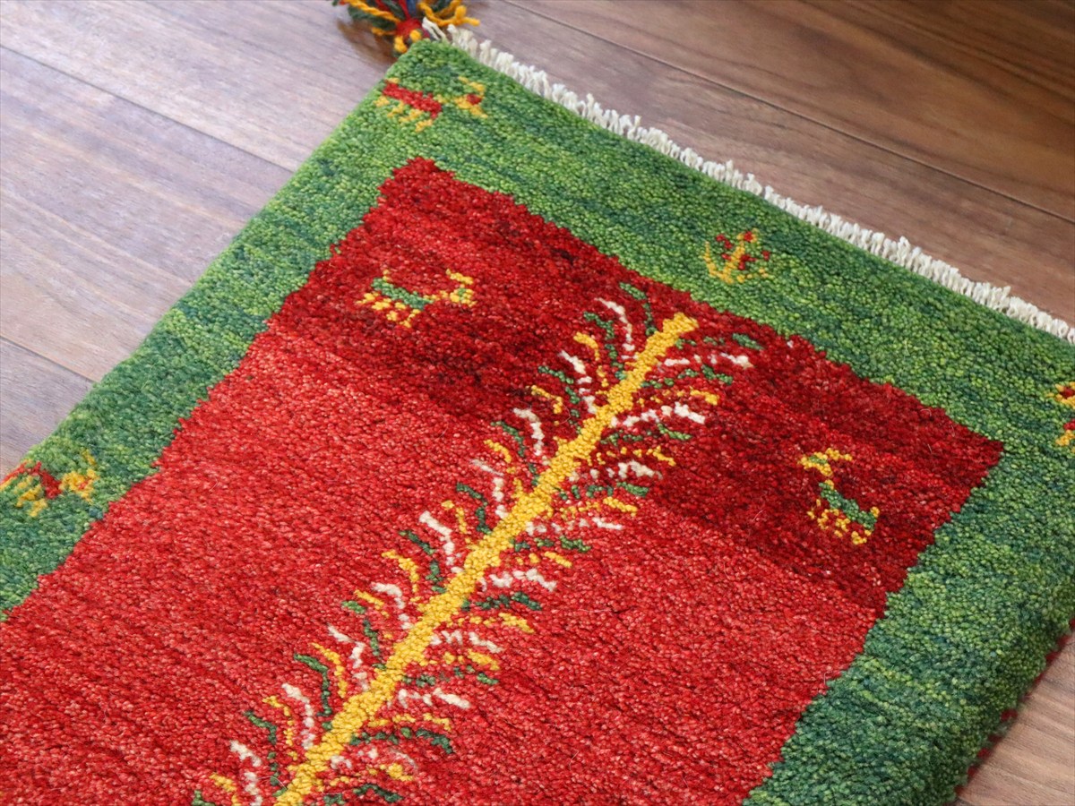 ギャッベ ミニギャベ イラン手織り 57×43cm レッド&グリーン 連なる生命の樹と動物