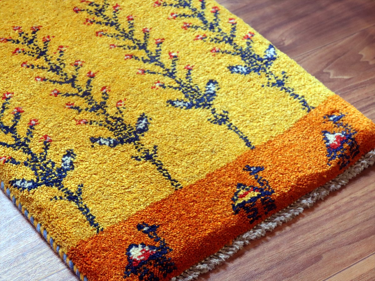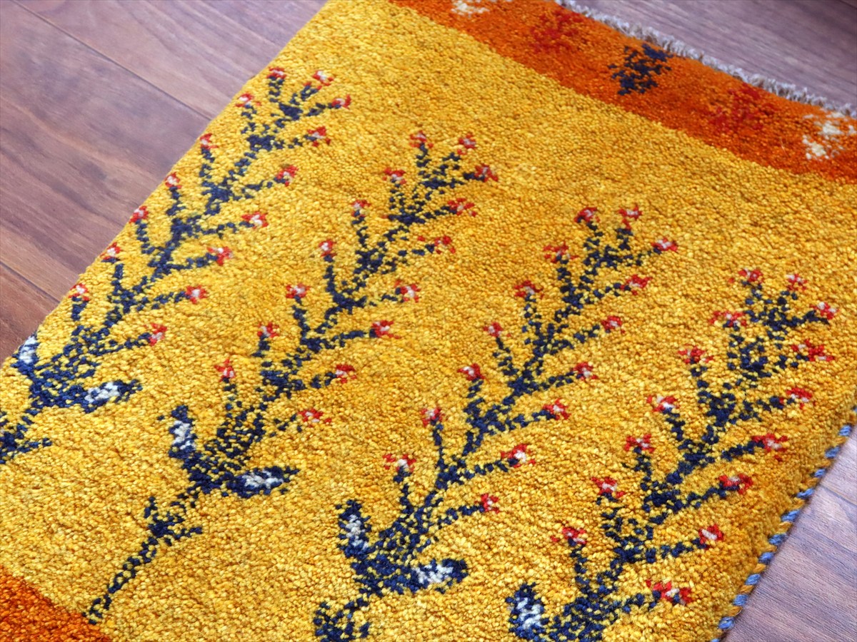 Key:ギャッベ,ギャベ,一点もの 現品販売 ラグ,ウール製,イラン,手織り,じゅうたん,絨毯,座布団, イエロー オレンジ 黄色 草木染, ガラタバザール Gabbeh, Handmade, Hand knotted, Tribal rug, Iran carpet, Wool, Natural Dye,