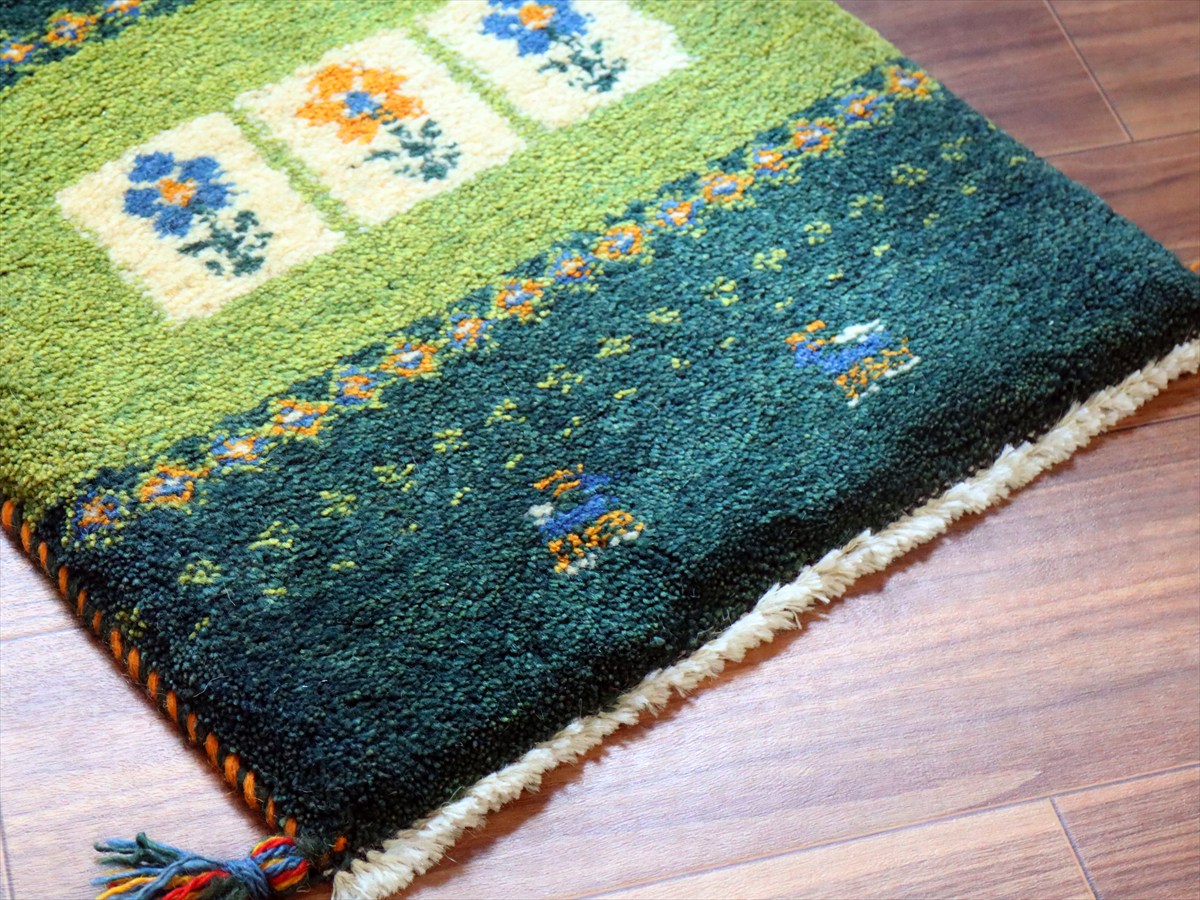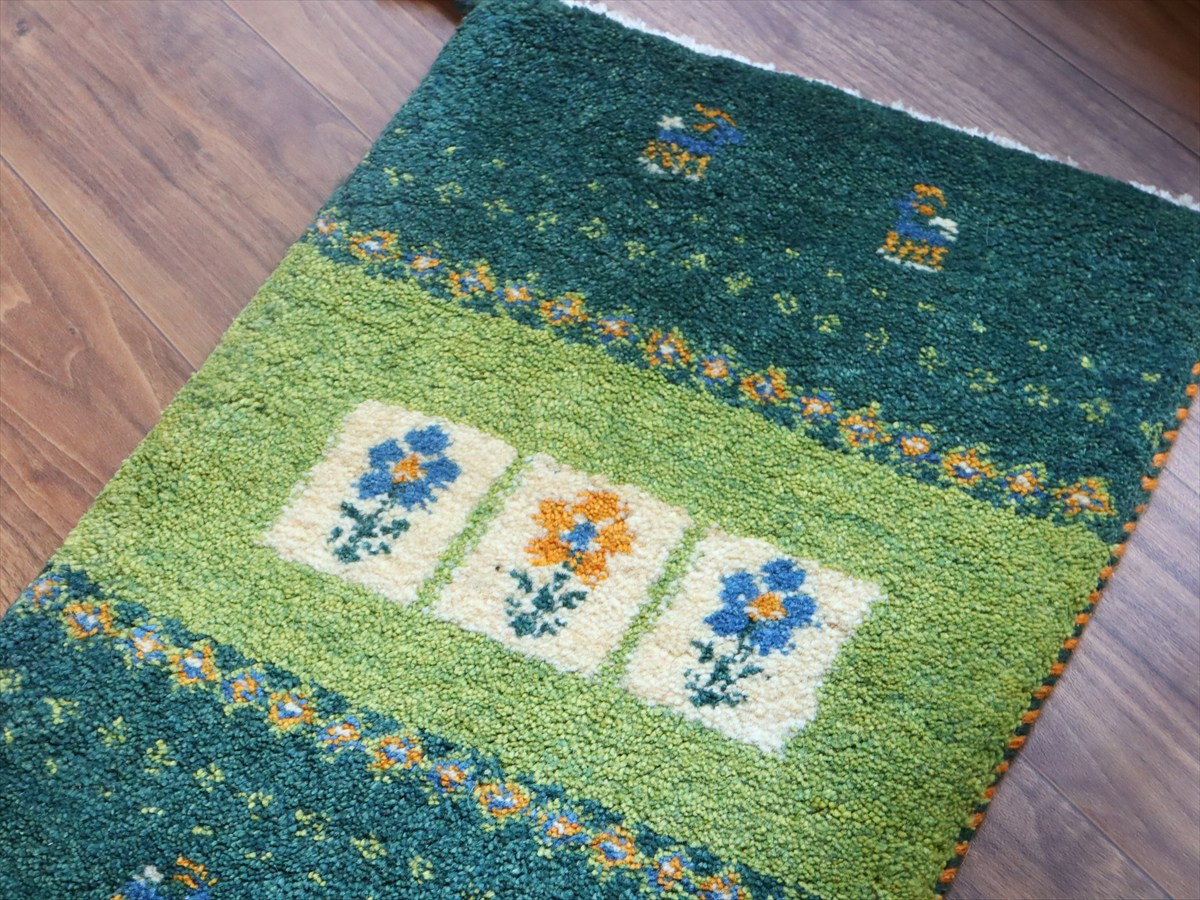 - ギャッベ ミニギャベ イラン手織り 58×43cm グリーン フラワーと動物