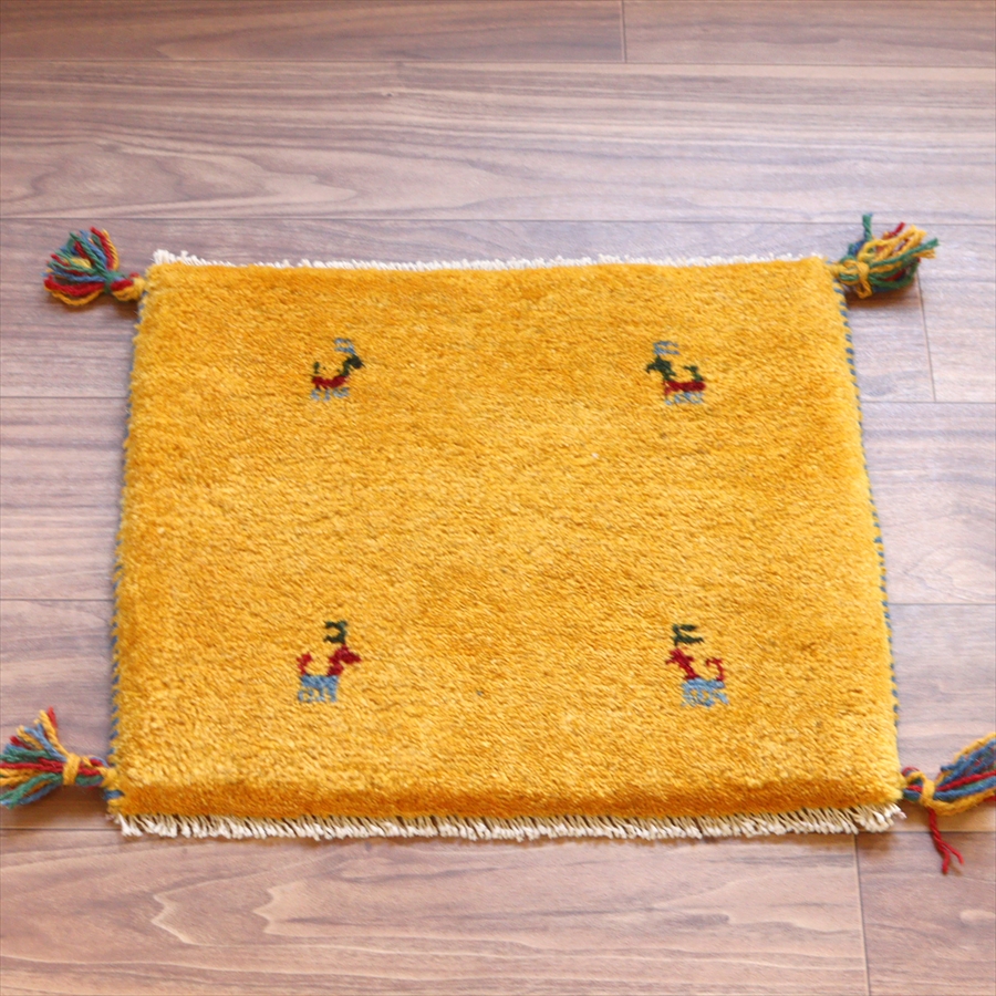 - ギャッベ イラン産手織り 座布団サイズ 40x47cm イエローオレンジ シンプル 無地 動物モチーフ