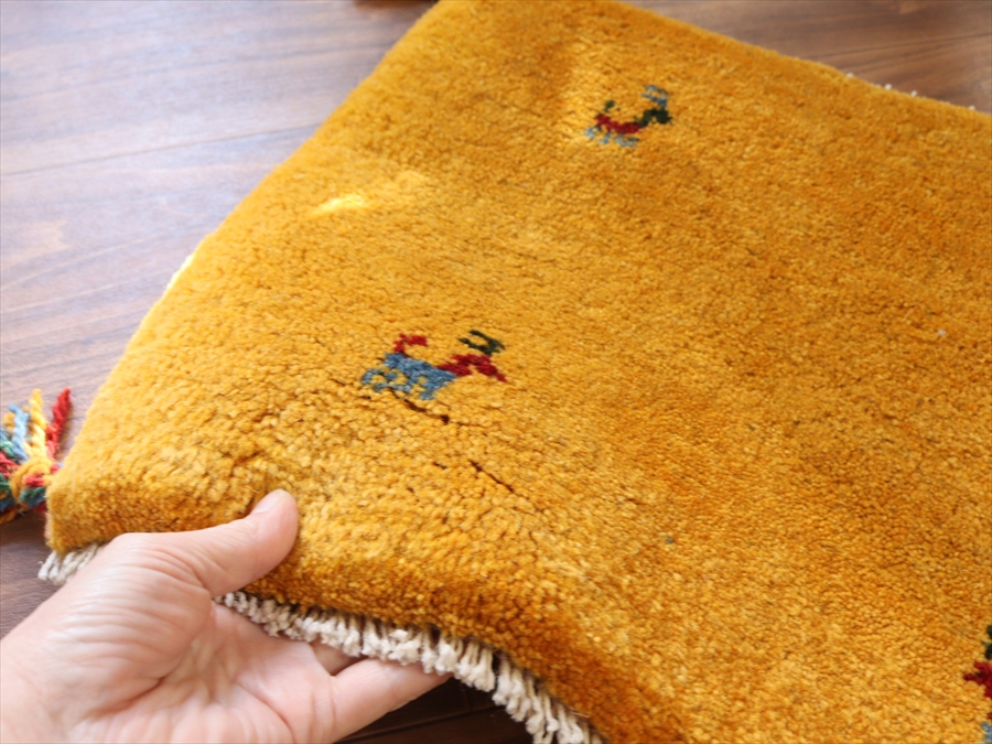 ギャッベ イラン産手織り 座布団サイズ 40x47cm イエローオレンジ シンプル 無地 動物モチーフ