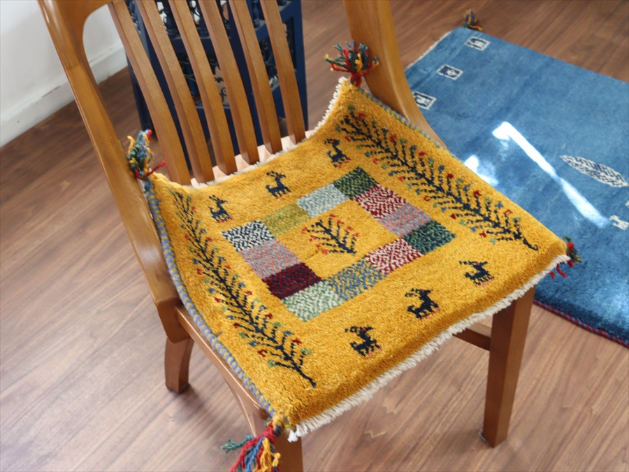 ギャッベ イラン産手織り 座布団サイズ 40x45cm イエロー 寒色系のタイルモチーフ 生命の木