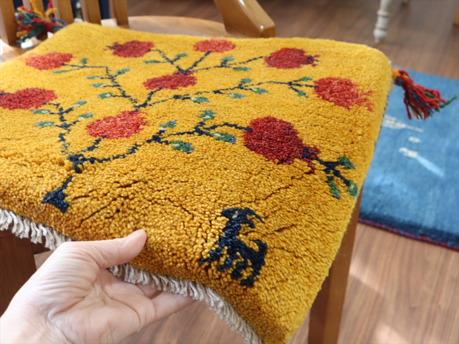 ギャッベ イラン産手織り 座布団サイズ 40x43cm イエロー ザクロの実