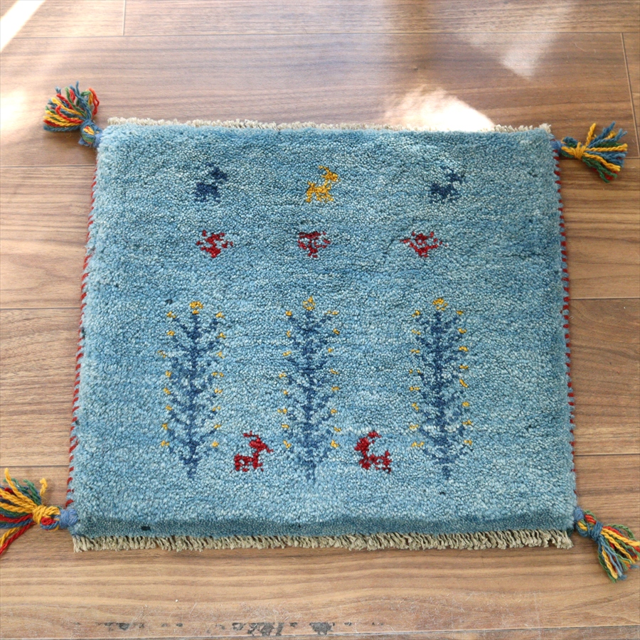 - ギャッベ イラン産手織り 座布団サイズ 40x44cm 明るいブルー 生命の木と動物