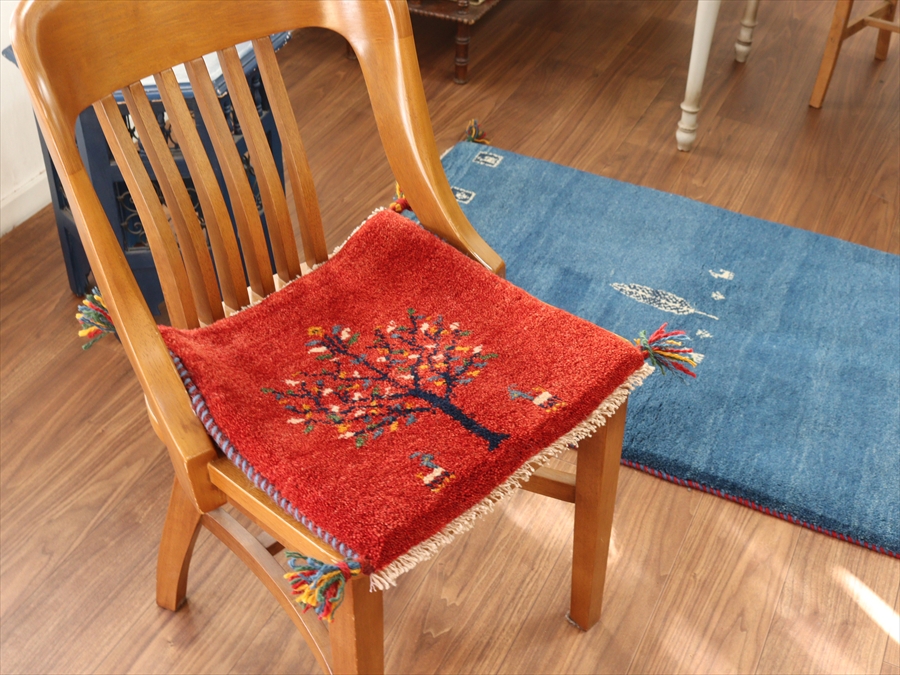- ギャッベ イラン産手織り 座布団サイズ 41x43cm レッド 花をつけた生命の木