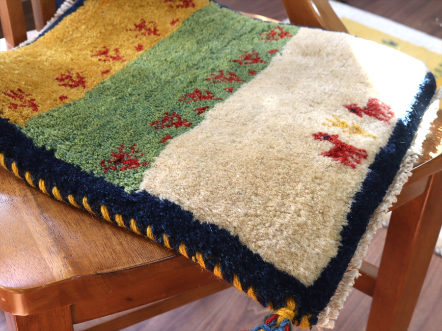 ギャッベ イラン産手織り 座布団サイズ 41x39cm イエロー グリーンアイボリー
