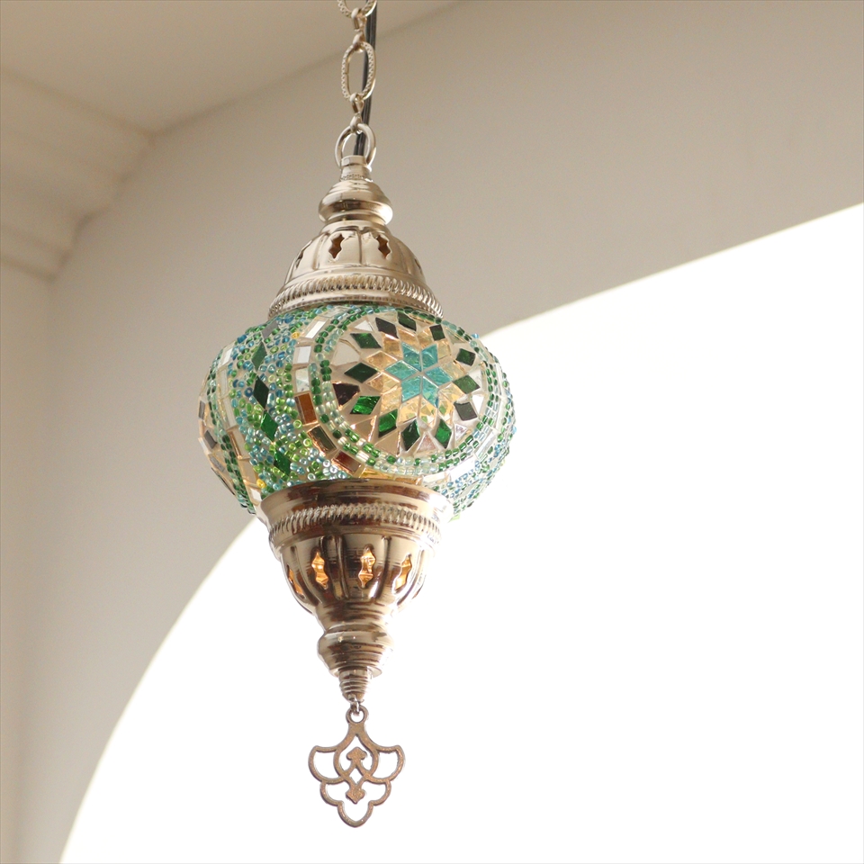 トルコランプ モザイクペンダントランプ 直径13cm 全高67cm ブルー/グリーン シルバーカラーの灯具