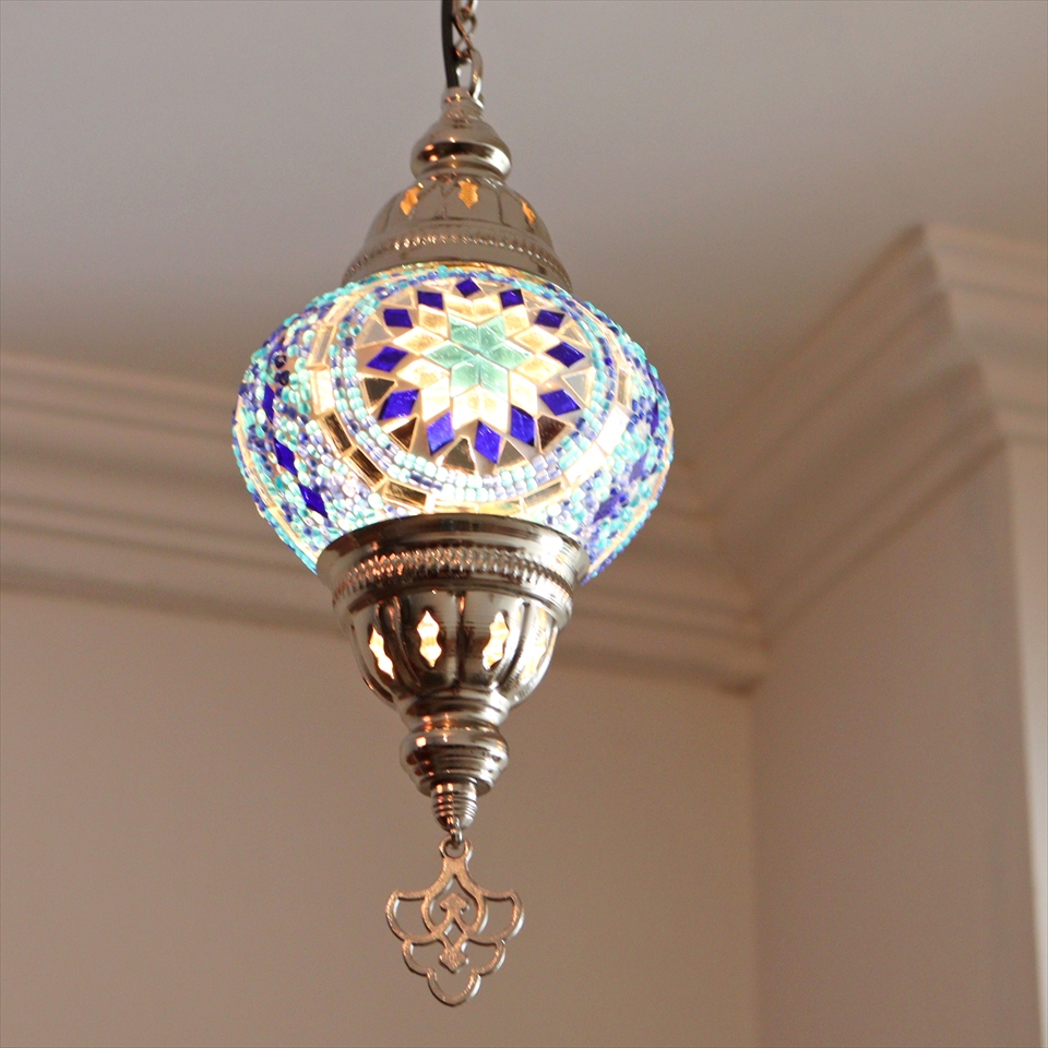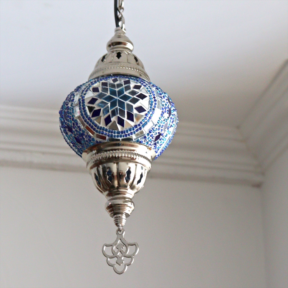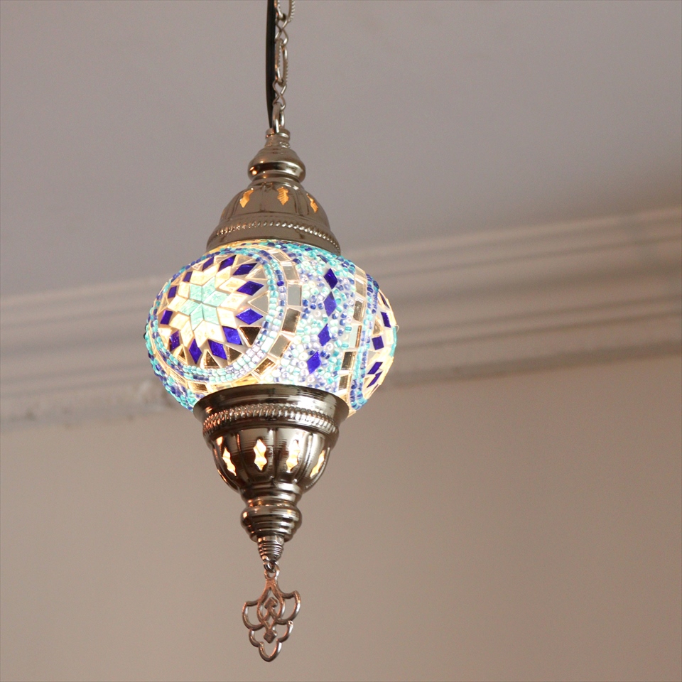 - トルコランプ モザイクペンダントランプ 直径13cm 全高67cm ブルー シルバーカラーの灯具