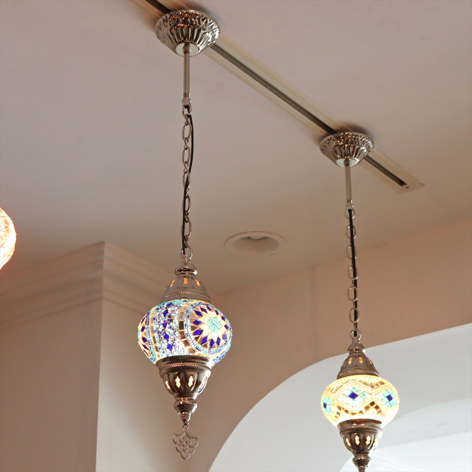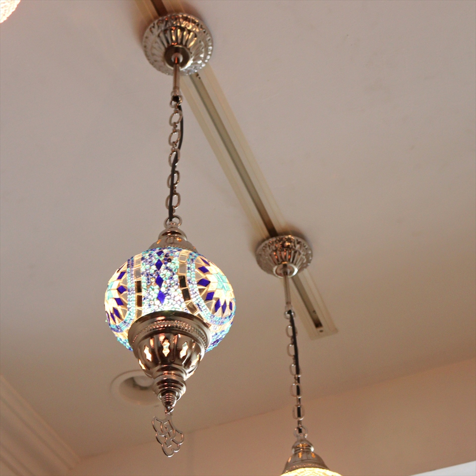 光沢のあるシルバーカラーの灯具と、トルコで手作りされたモザイクガラス球が使われたモザイクペンダントランプです。