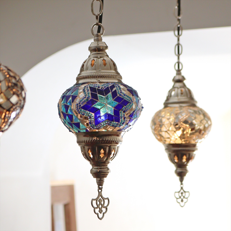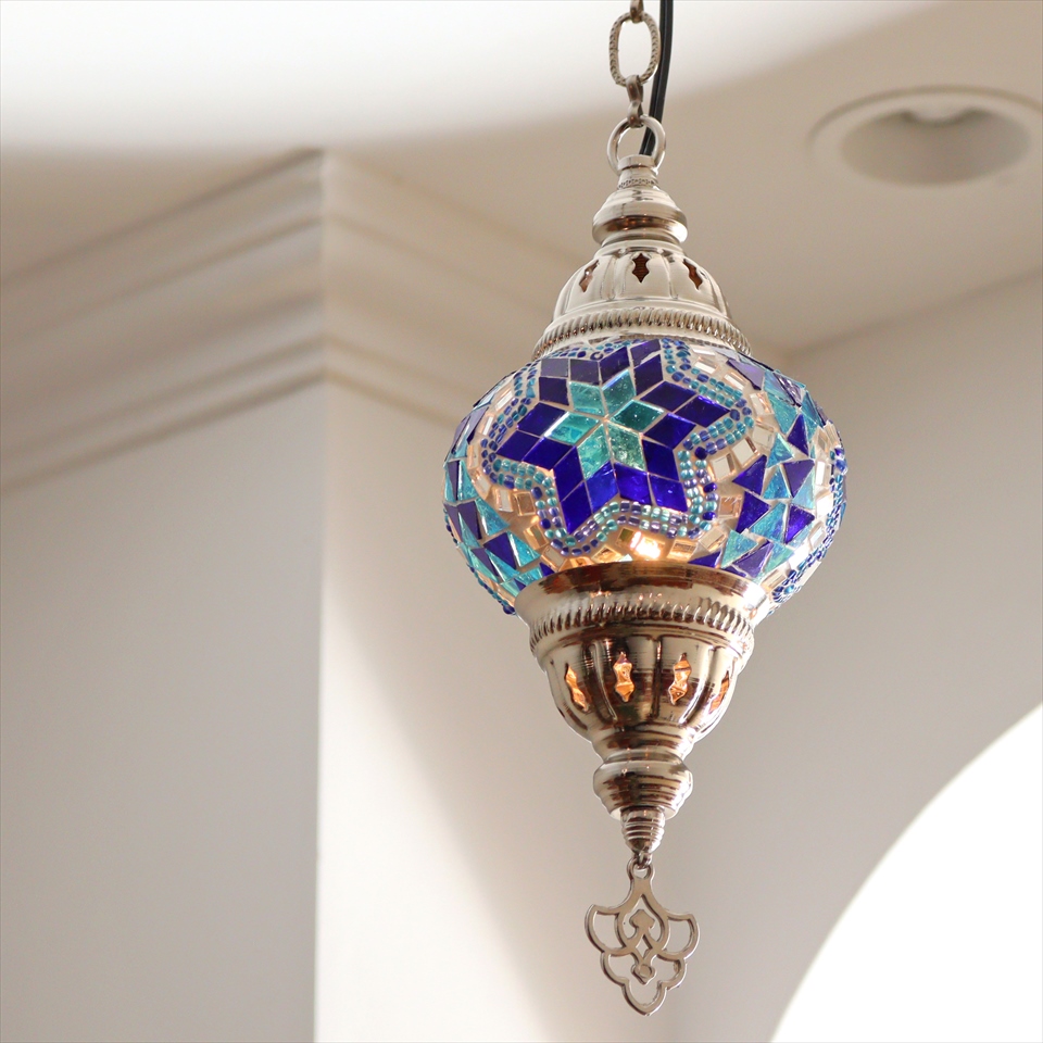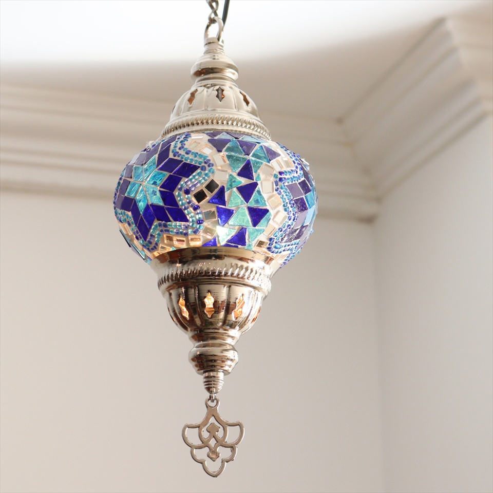 - トルコランプ モザイクペンダントランプ 直径13cm 全高67cm ブルー シルバーカラーの灯具