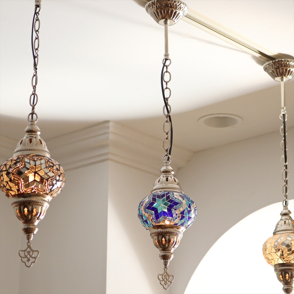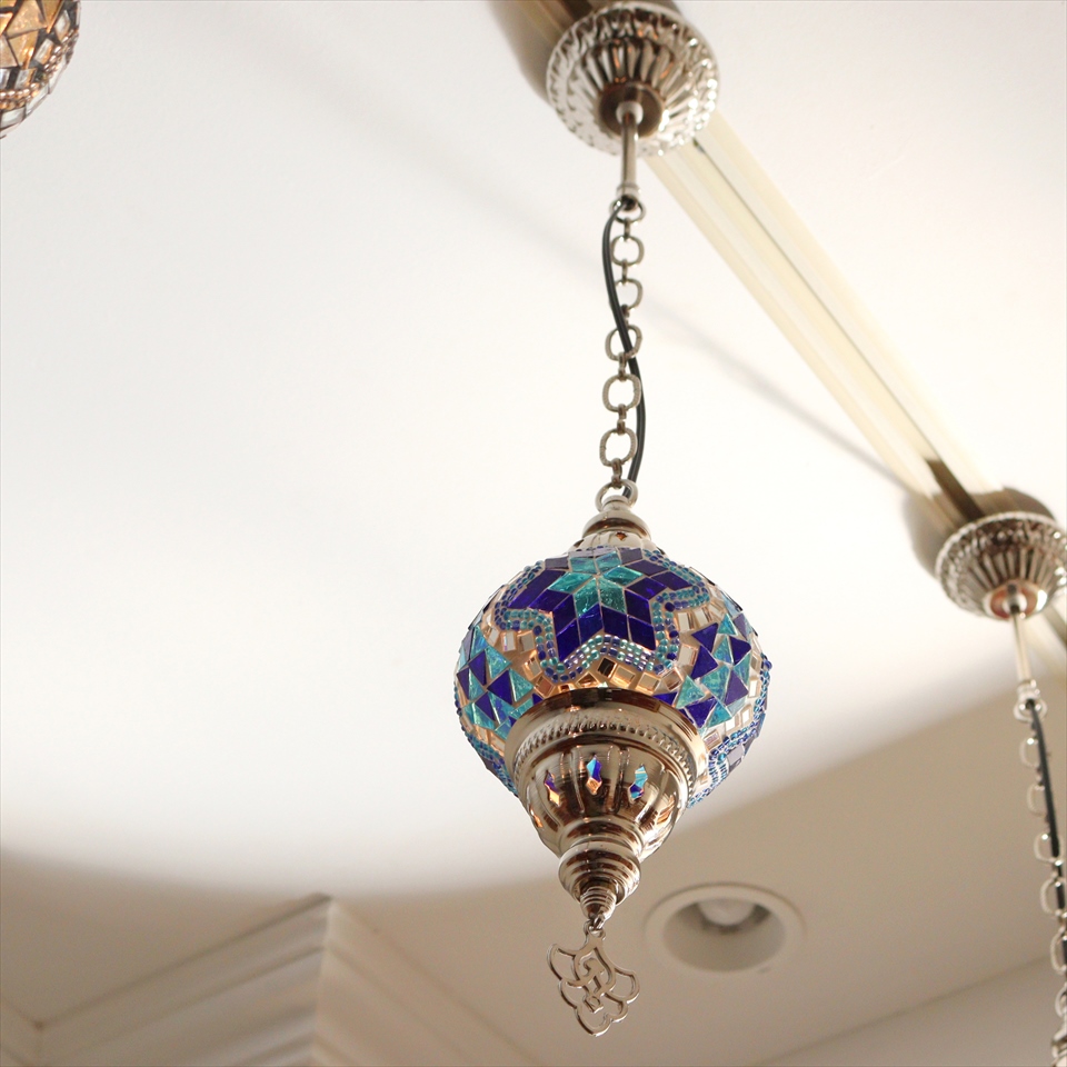 光沢のあるシルバーカラーの灯具と、トルコで手作りされたモザイクガラス球が使われたモザイクペンダントランプです。
