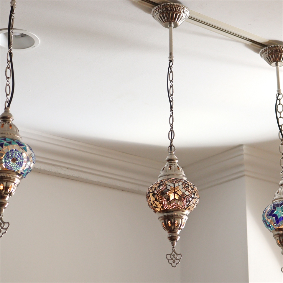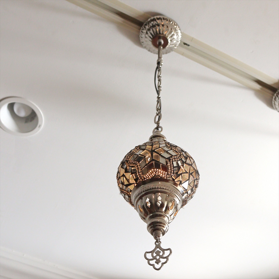 光沢のあるシルバーカラーの灯具と、トルコで手作りされたモザイクガラス球が使われたモザイクペンダントランプです。