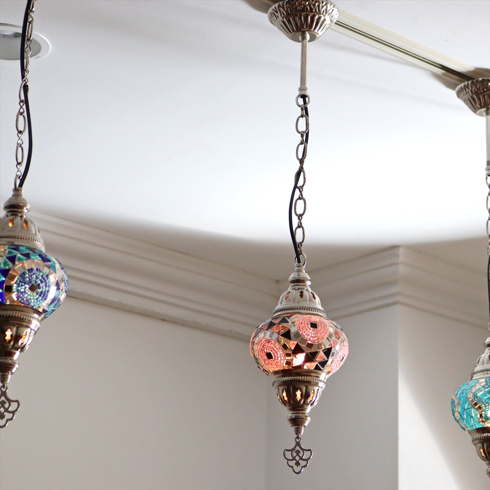 光沢のあるシルバーカラーの灯具と、トルコで手作りされたモザイクガラス球が使われたモザイクペンダントランプです。