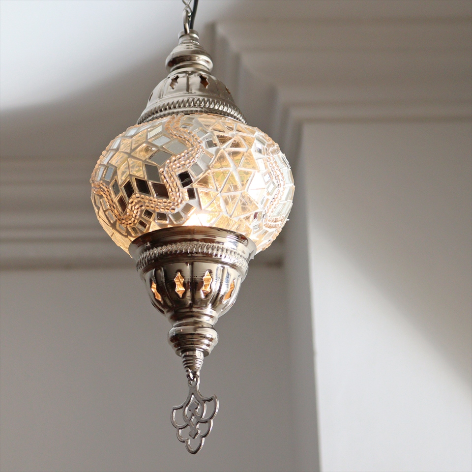トルコランプ モザイクペンダントランプ 直径13cm 全高67cm ホワイト シルバーカラーの灯具