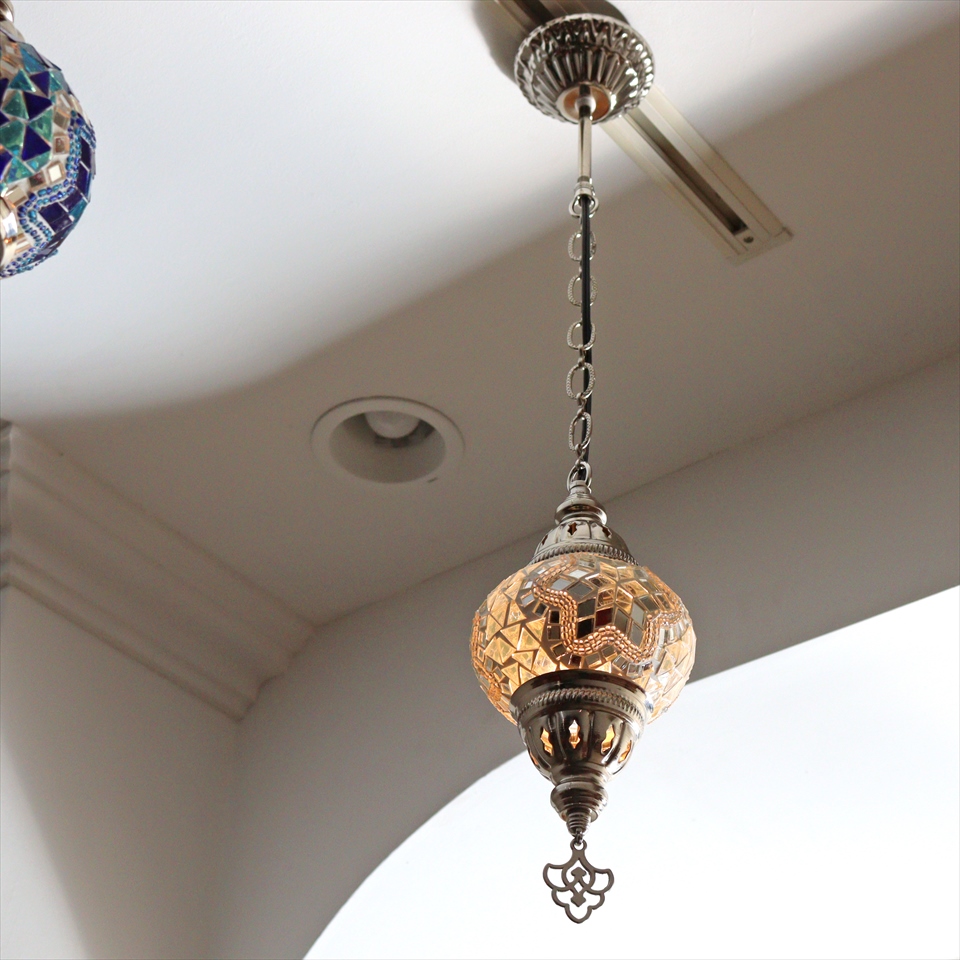 光沢のあるシルバーカラーの灯具と、トルコで手作りされたモザイクガラス球が使われたモザイクペンダントランプです。
