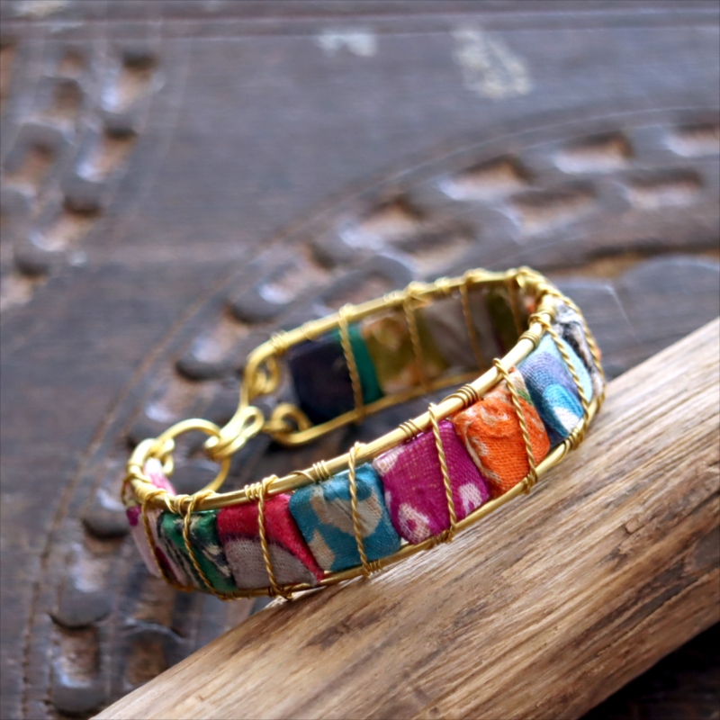 フックでとめるタイプのバングルです。布で包まれた14粒の四角いビーズを並べ、真鍮ワイヤーでつないであります。