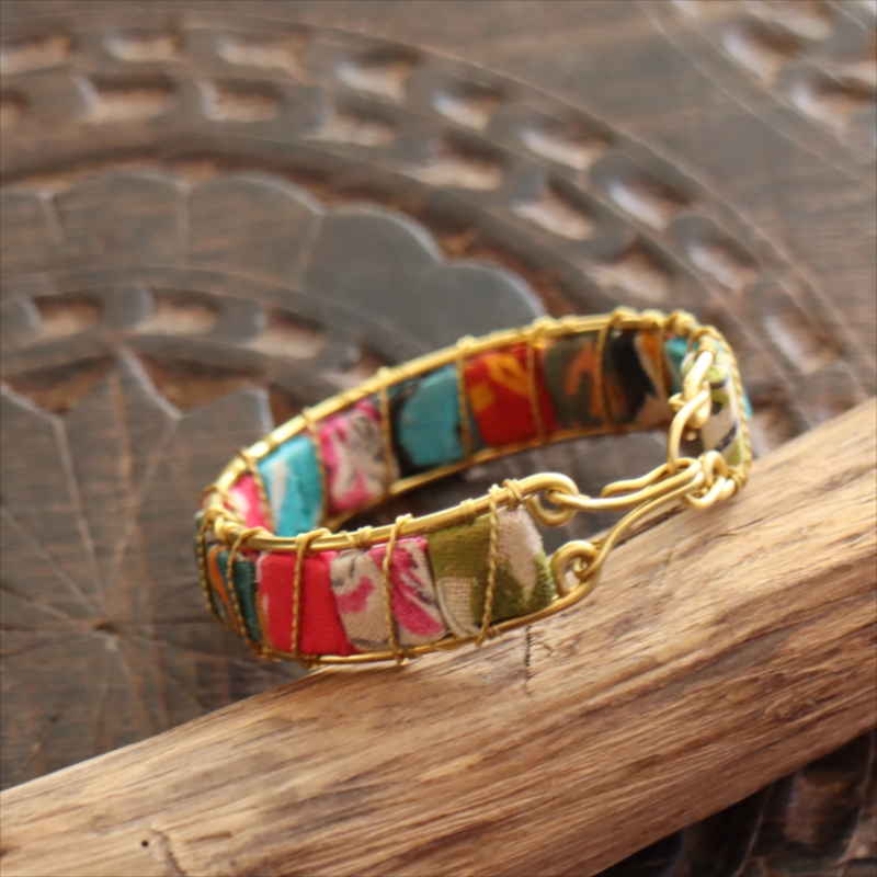フックでとめるタイプのバングルです。布で包まれた14粒の四角いビーズを並べ、真鍮ワイヤーでつないであります。