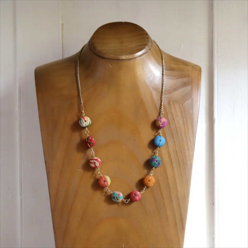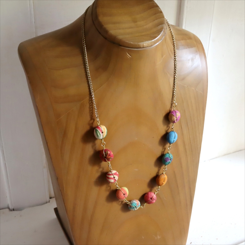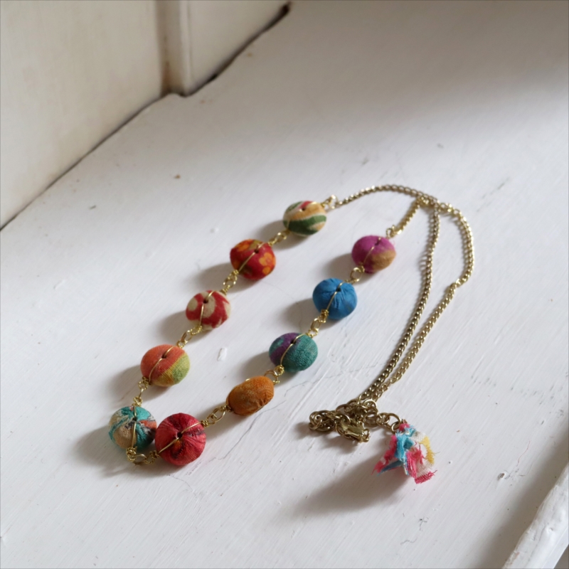 リサイクルサリーの布で包まれたカラフルな10粒のビーズを、真鍮チェーンでつなぎ合わせた手作り感あるネックレスです。60cmの長さがあり、軽い作りなので、セーターやTシャツなどに合わせてカジュアルに楽しめます。