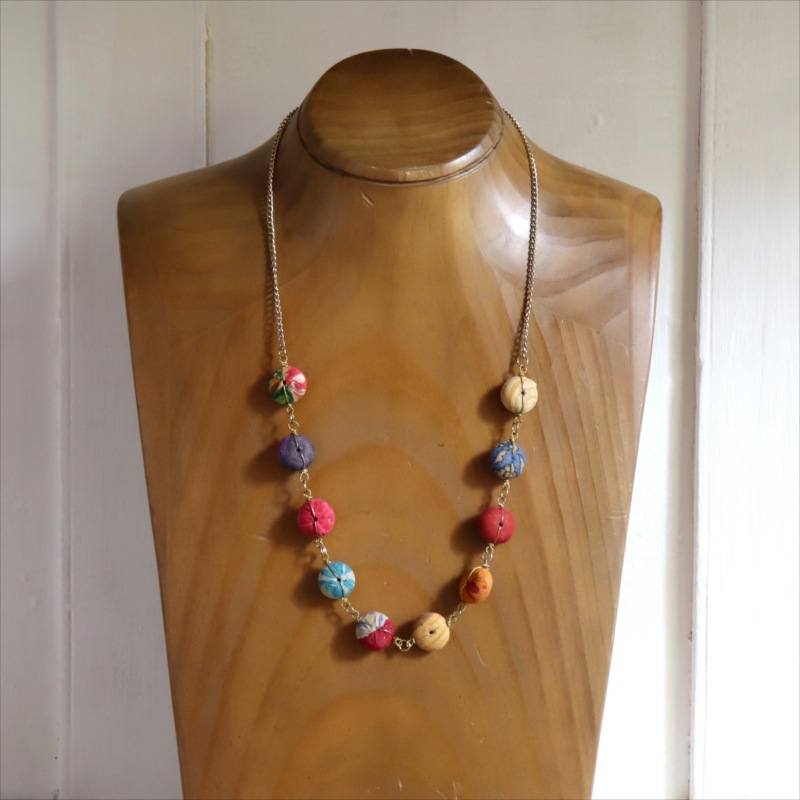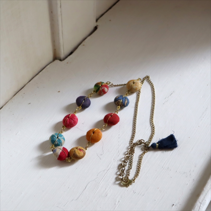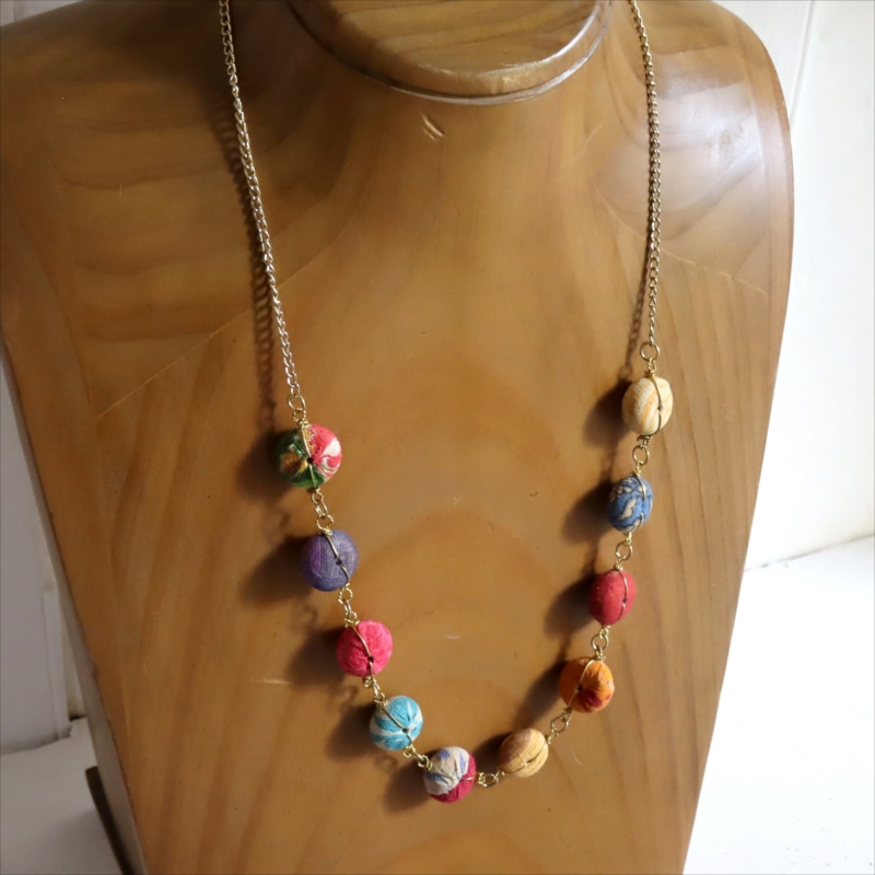 リサイクルサリーの布で包まれたカラフルな10粒のビーズを、真鍮チェーンでつなぎ合わせた手作り感あるネックレスです。60cmの長さがあり、軽い作りなので、セーターやTシャツなどに合わせてカジュアルに楽しめます。