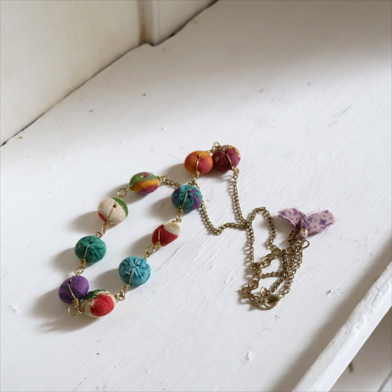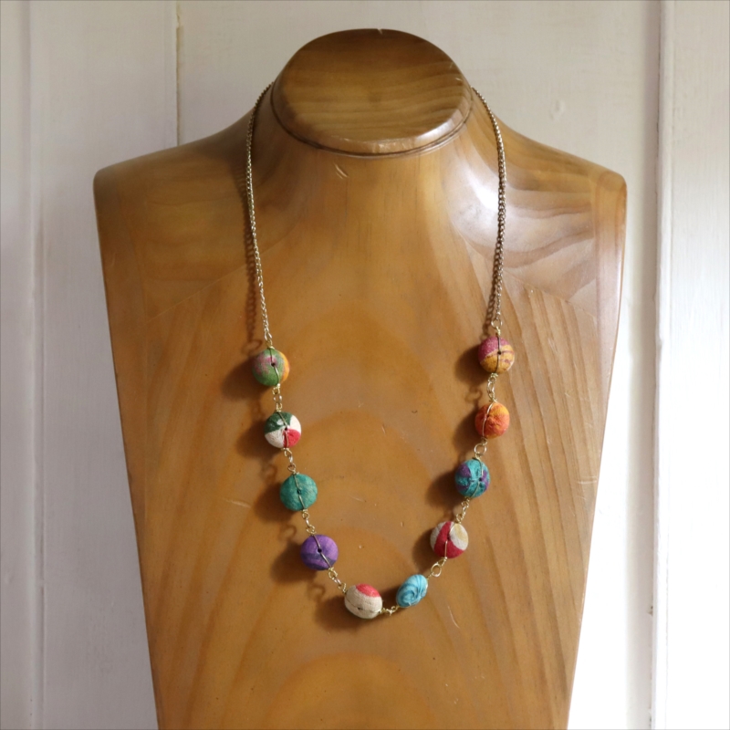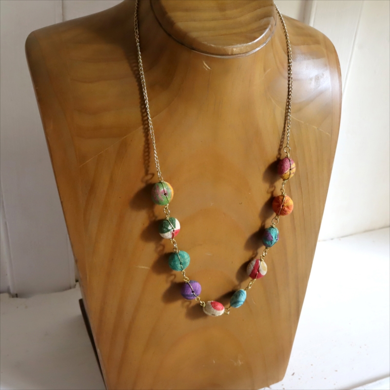 リサイクルサリーの布で包まれたカラフルな10粒のビーズを、真鍮チェーンでつなぎ合わせた手作り感あるネックレスです。60cmの長さがあり、軽い作りなので、セーターやTシャツなどに合わせてカジュアルに楽しめます。