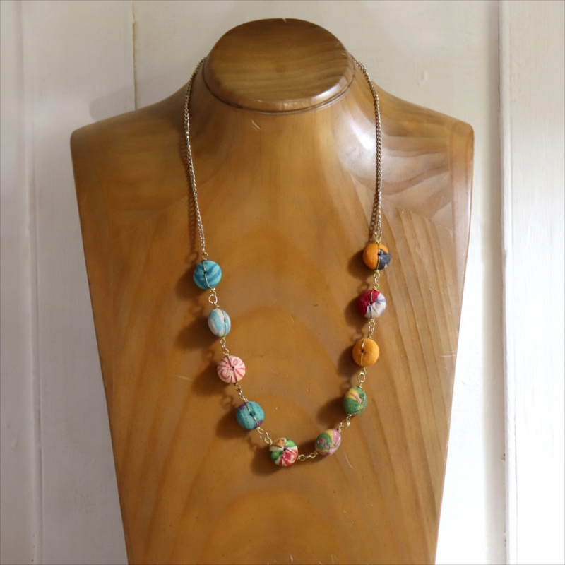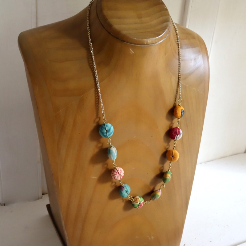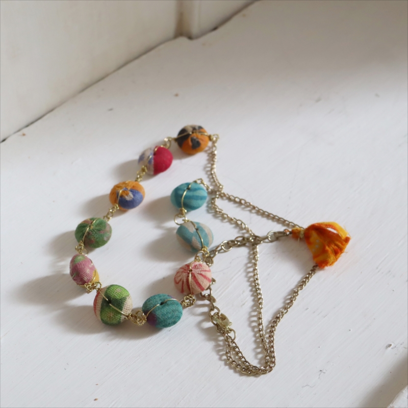 リサイクルサリーの布で包まれたカラフルな10粒のビーズを、真鍮チェーンでつなぎ合わせた手作り感あるネックレスです。60cmの長さがあり、軽い作りなので、セーターやTシャツなどに合わせてカジュアルに楽しめます。