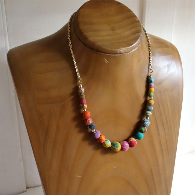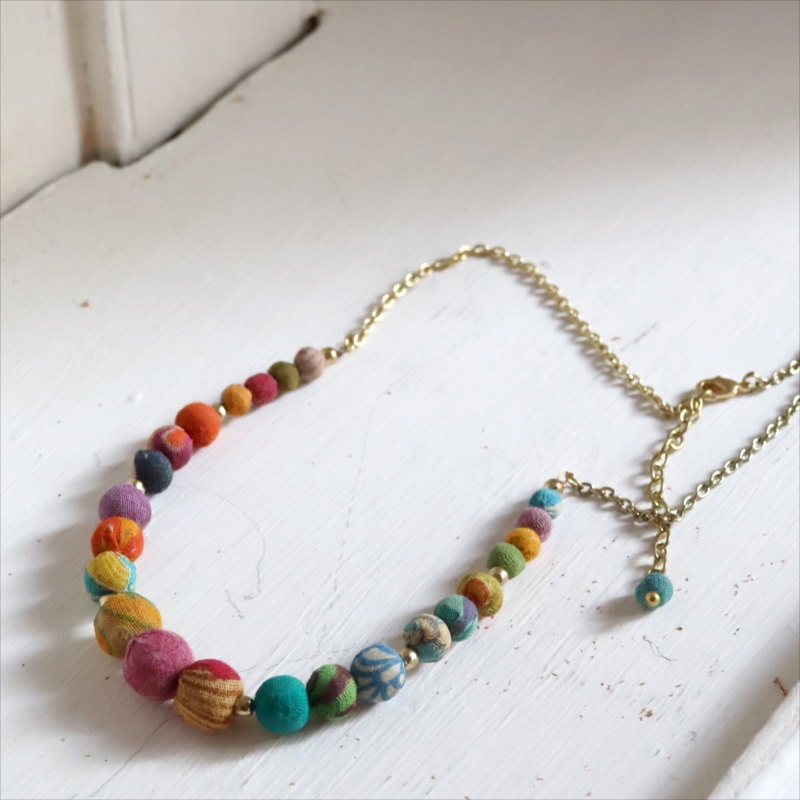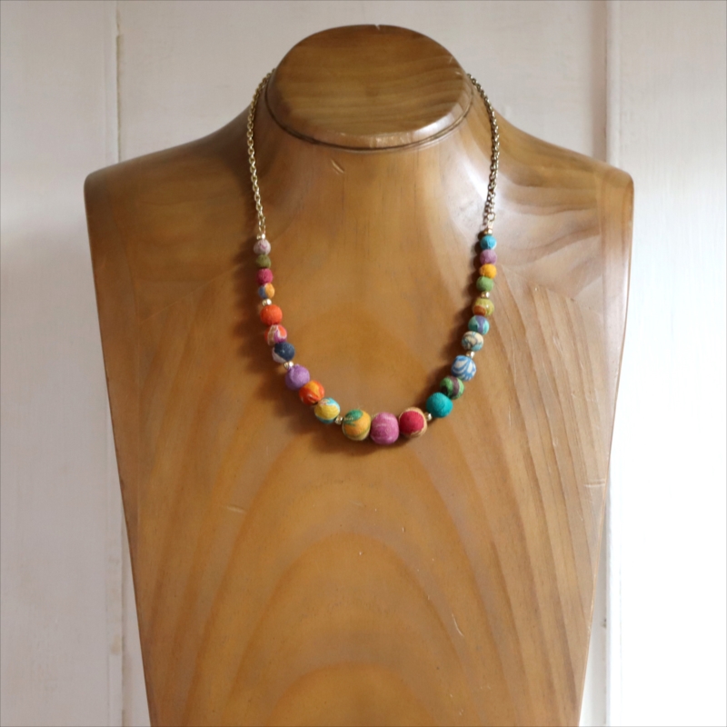 大きさの異なる布で包まれたビーズをつないだクラフト感あるネックレスです。