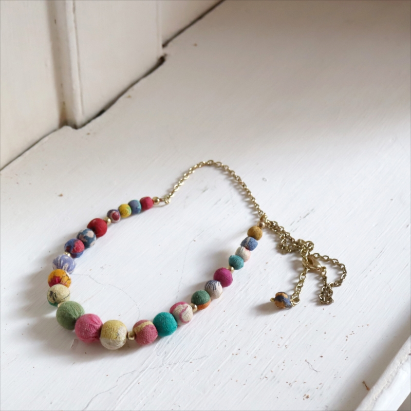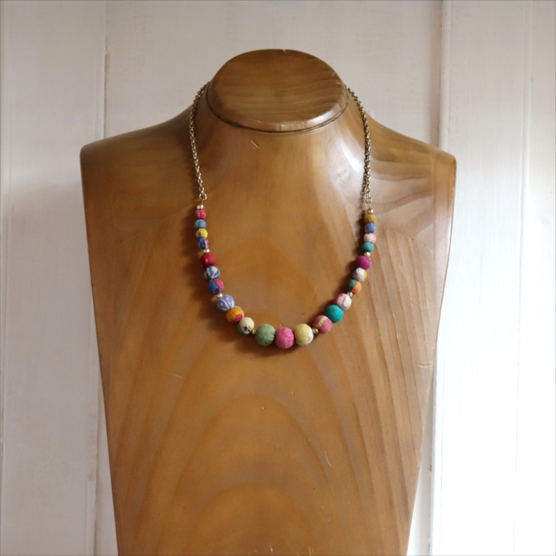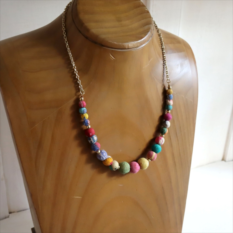 大きさの異なる布で包まれたビーズをつないだクラフト感あるネックレスです。