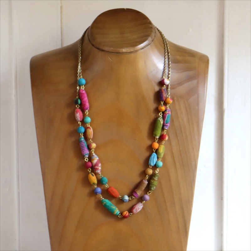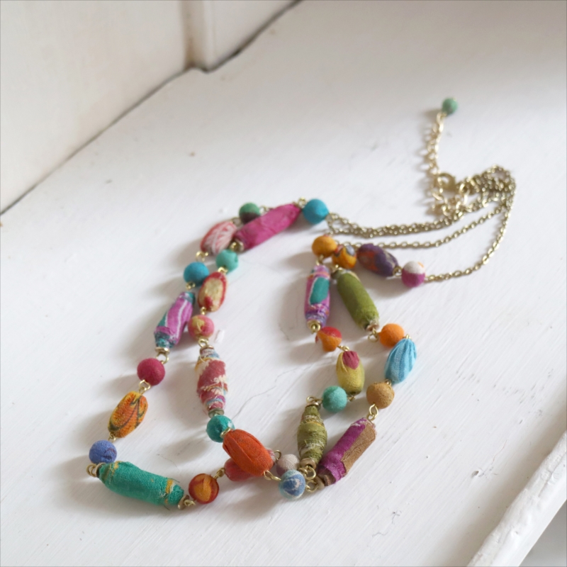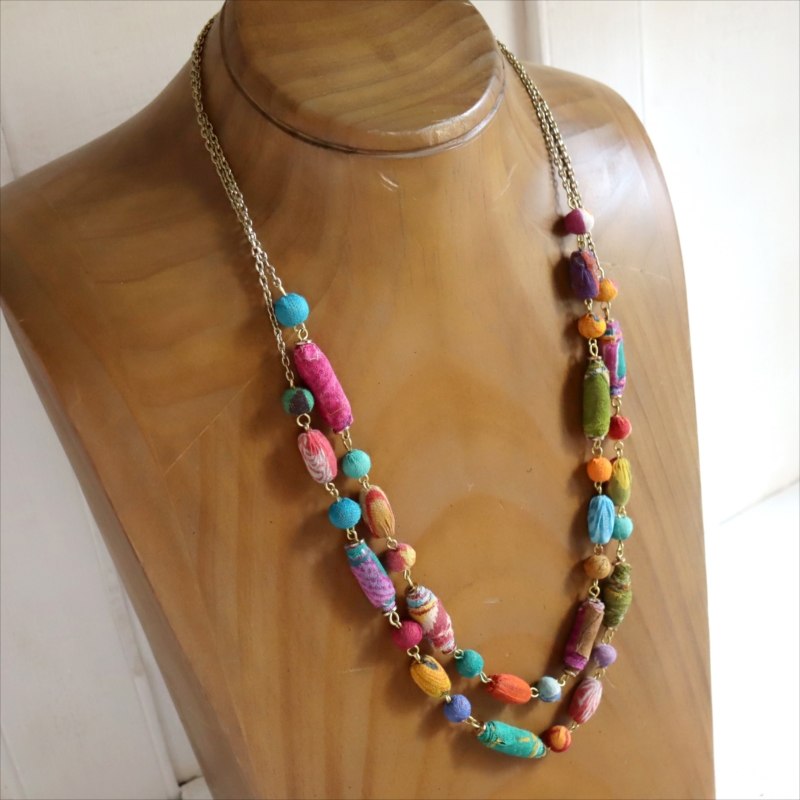 リサイクルサリービーズ 2連ネックレス カラフルな手作り布ビーズ 1点もの