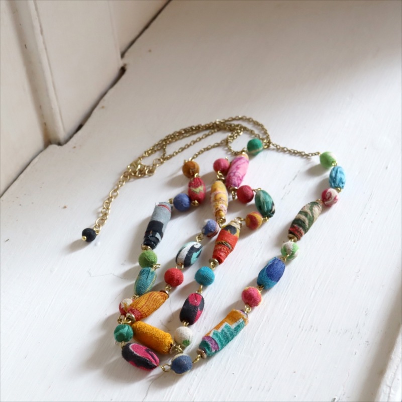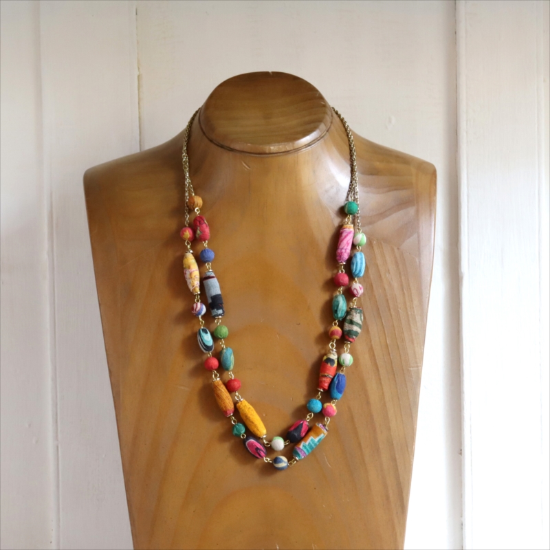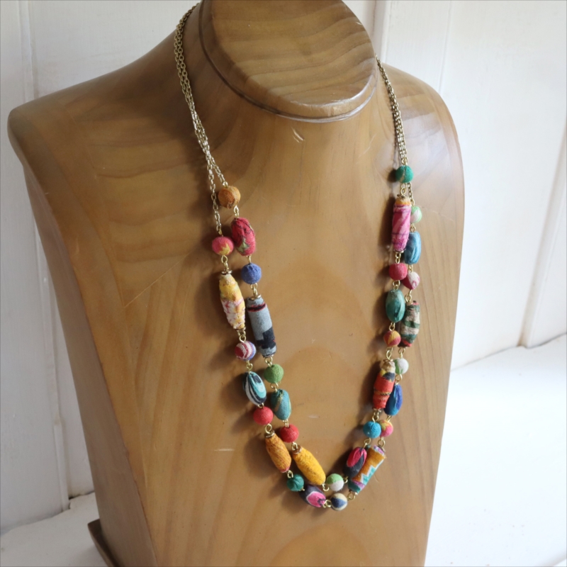 リサイクルサリービーズ 2連ネックレス カラフルな手作り布ビーズ 1点もの