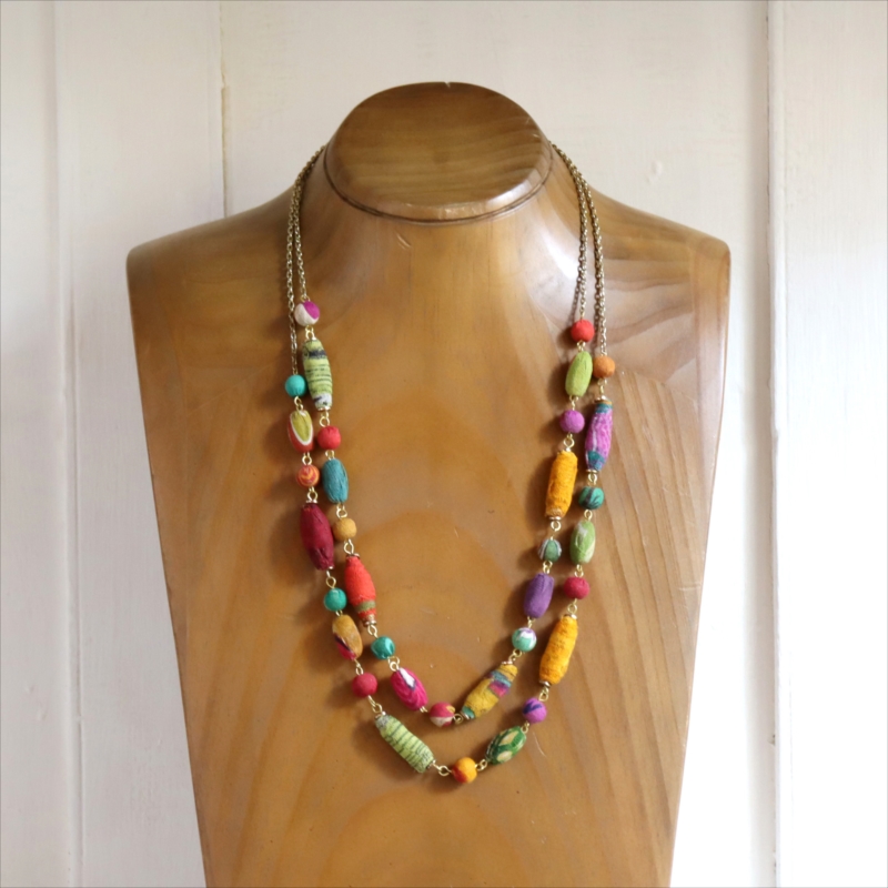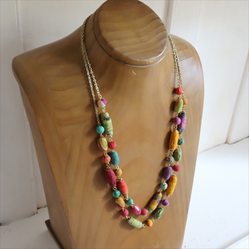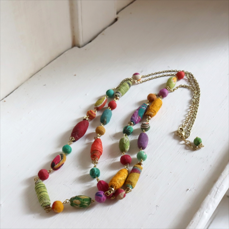 リサイクルサリービーズ 2連ネックレス カラフルな手作り布ビーズ 1点もの