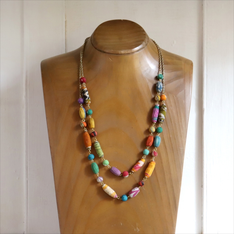 - リサイクルサリービーズ 2連ネックレス カラフルな手作り布ビーズ 1点もの
