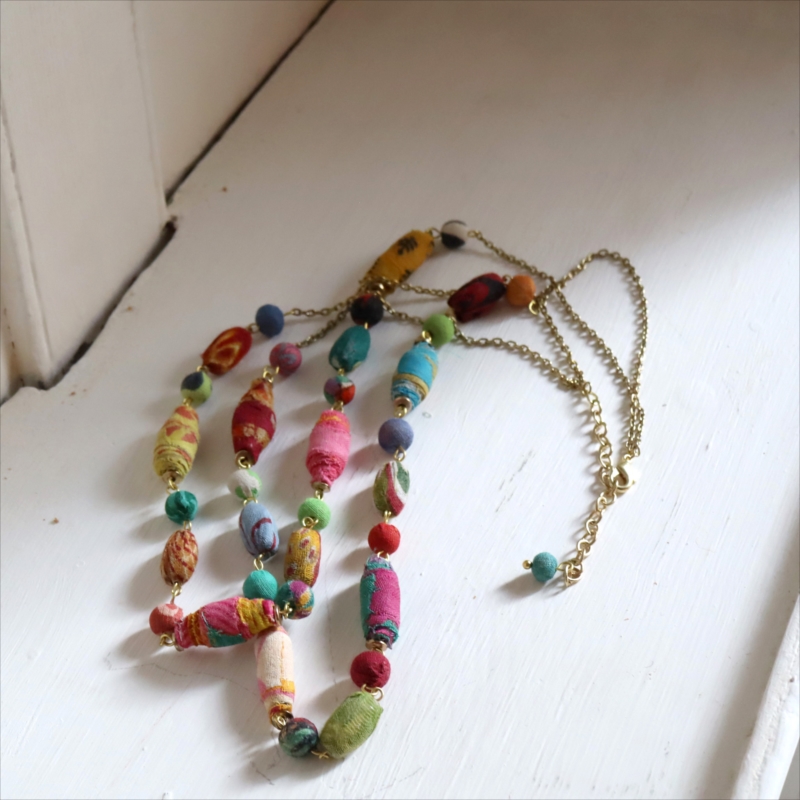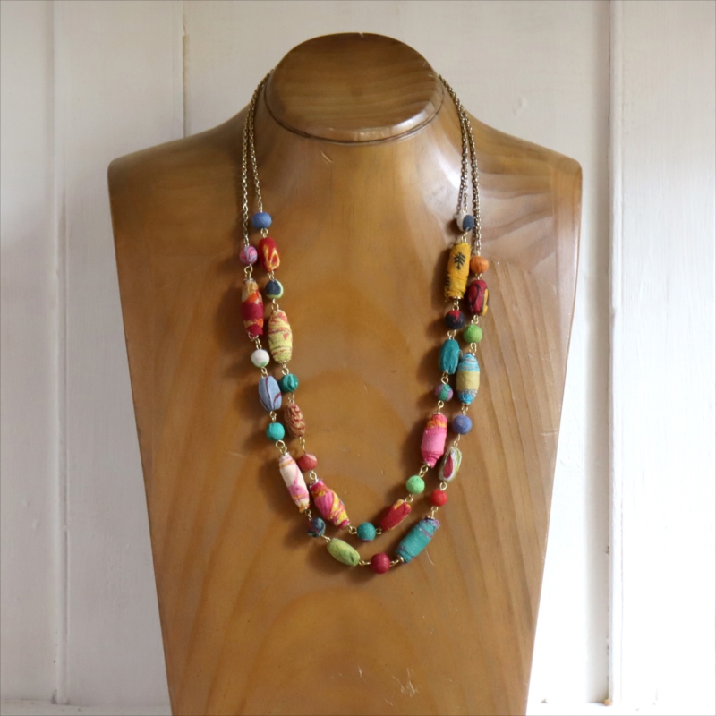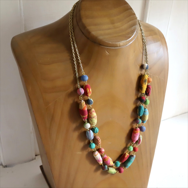 リサイクルサリービーズ 2連ネックレス カラフルな手作り布ビーズ 1点もの