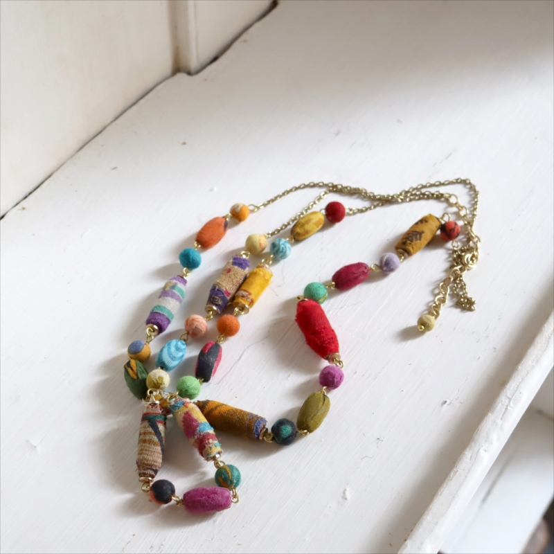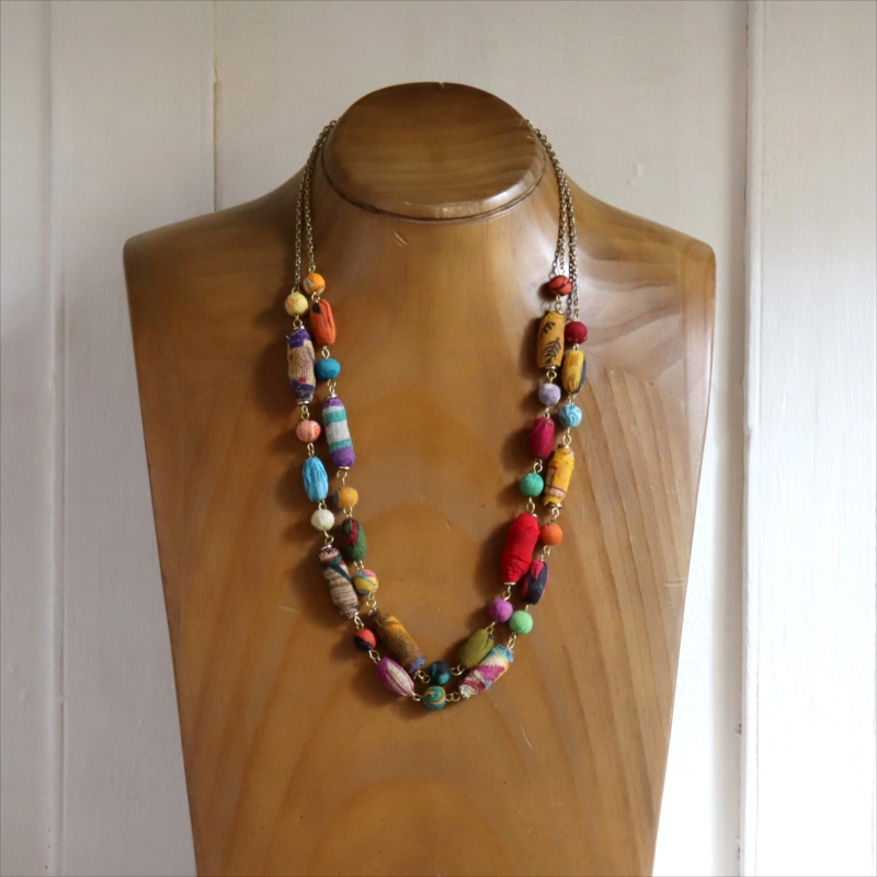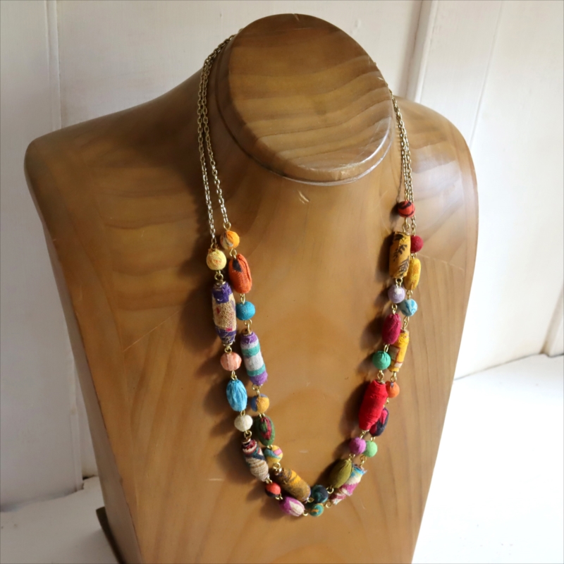 リサイクルサリービーズ 2連ネックレス カラフルな手作り布ビーズ 1点もの