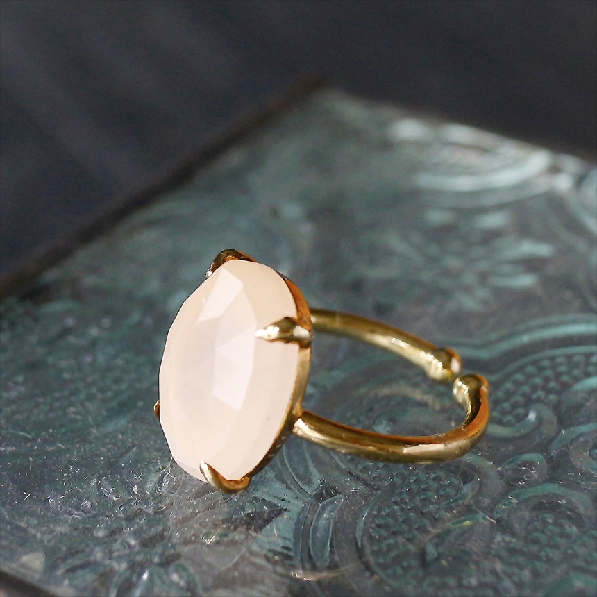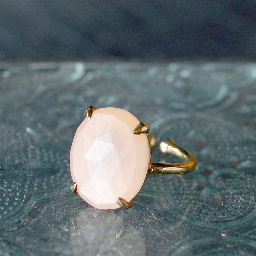 淡い桃色とオレンジが溶け合い、光を受けるたびにシラーと呼ばれる幻想的な光彩がゆらめくピーチムーンストーンのリングです。石の個性が際立つシンプルなデザインに仕上げました。裏面は光を透す仕様になっています。
