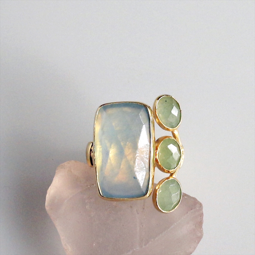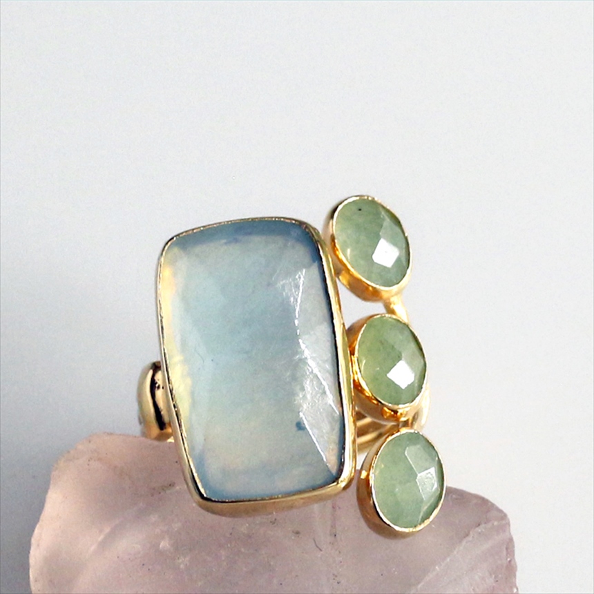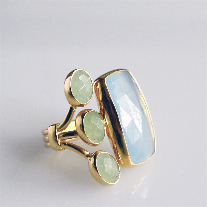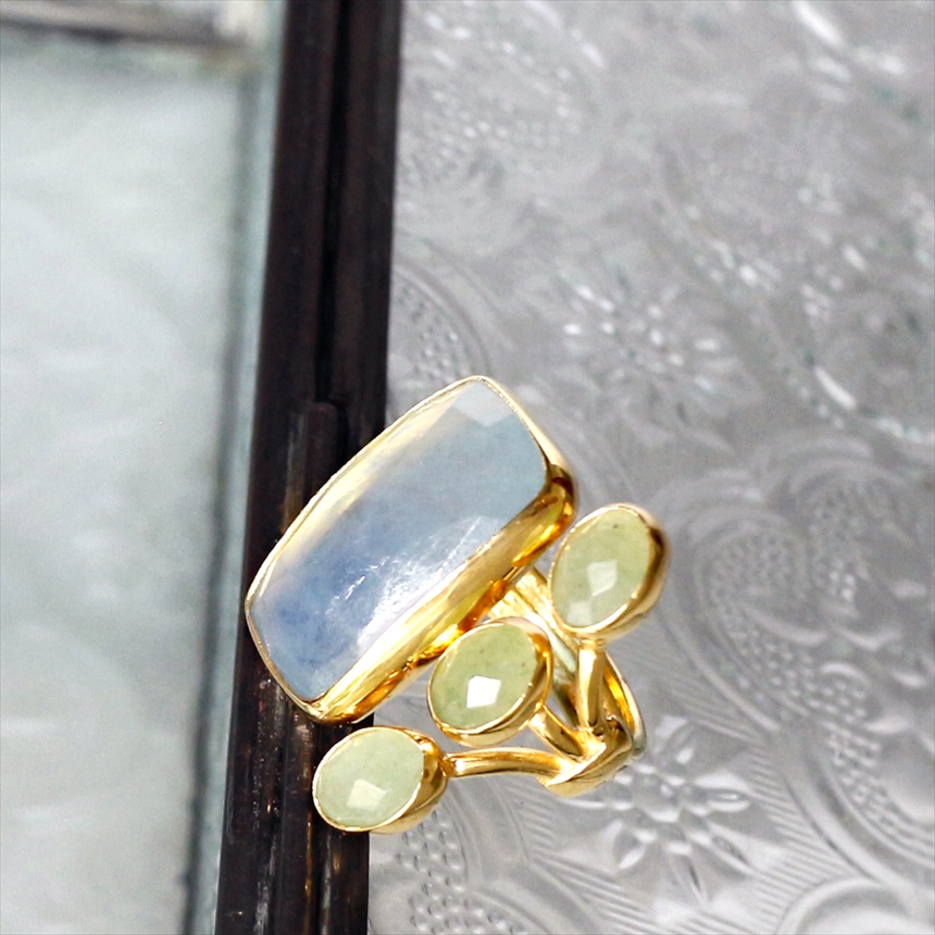 光を閉じ込めたような澄み切った淡いブルーのアクアマリンと、優しいグリーンのグリーンアベンチュリンの大変美しいリングです。大粒のアクアマリンにかわいらしいサイズのグリーンアベンチュリンが三つ寄り添うようについたデザイン。それぞれの石は裏面が抜けているので、光を透す仕様になっています。