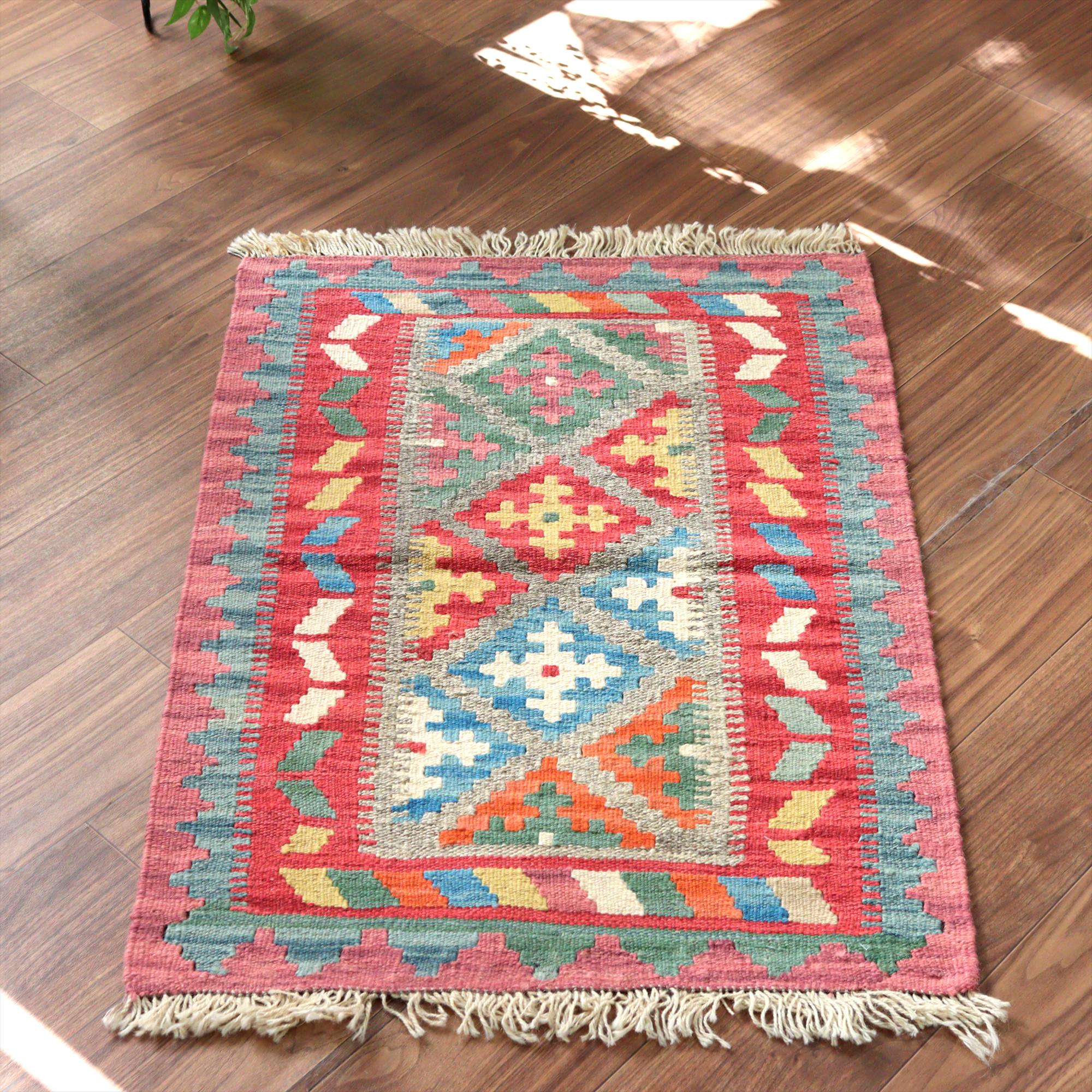 - 手織りキリム イラン シラーズ91×65cm カラフルな幾何学モチーフ
