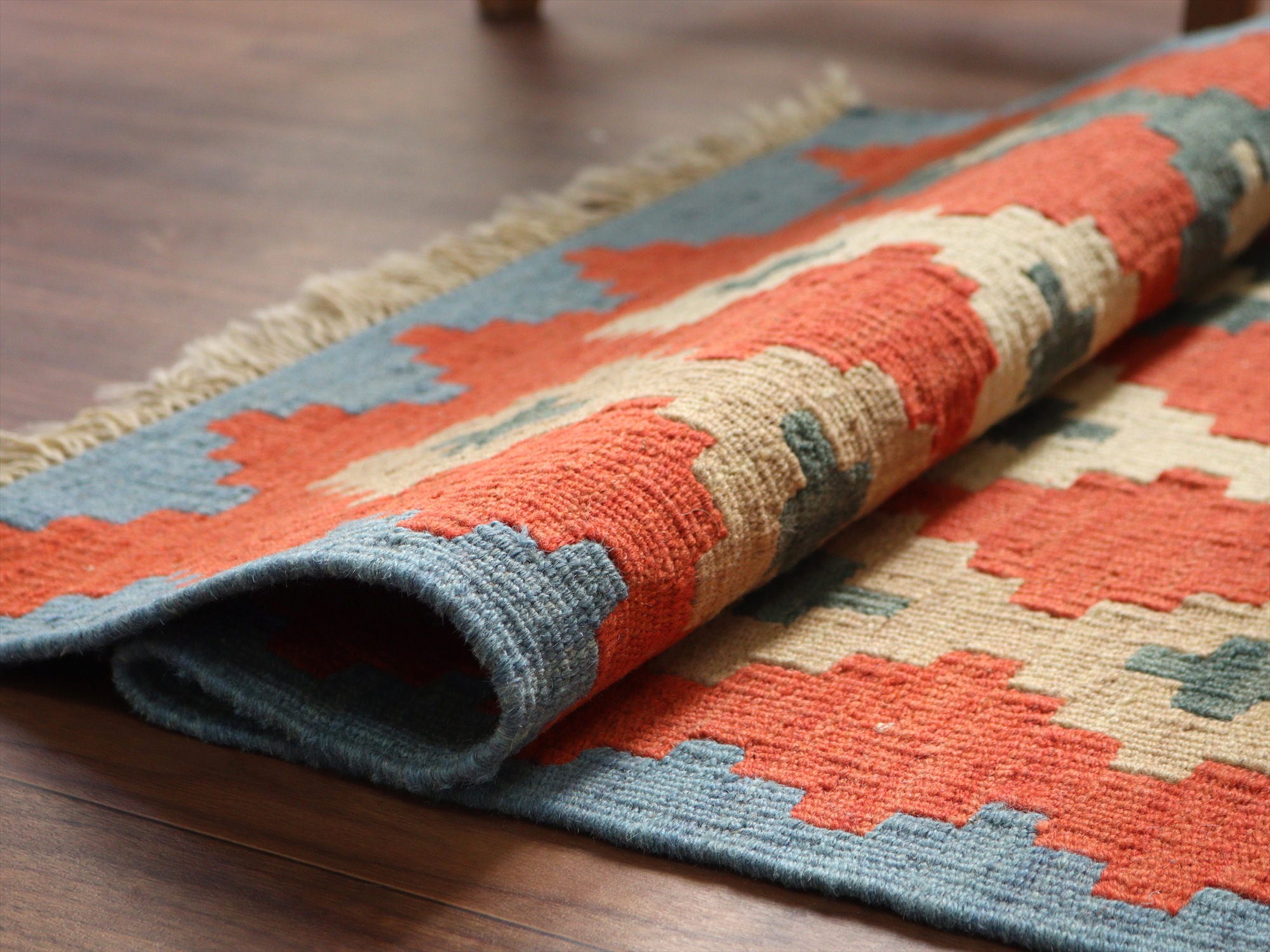 6-7mm程度の厚みがあり、パイル(毛足)がない平織りの敷物で表面は少しザラっとした肌ざわりです。織り手の自由なアイデアでデザインされていますので、左右対象でなかったり、モチーフが少しずれていたりということもありますが、世界で一枚だけの作品ですからその点はご了承ください。