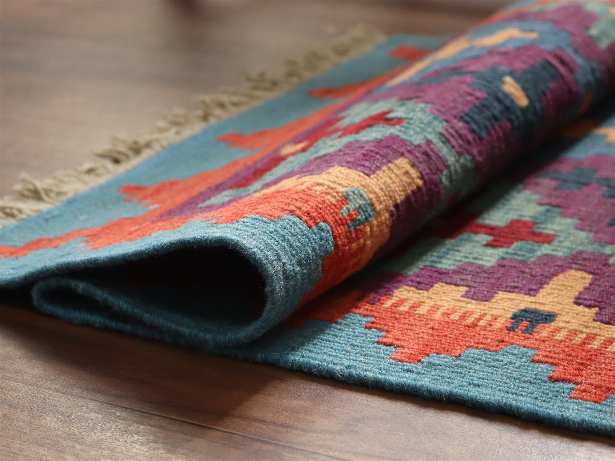 - 手織りキリム イラン シラーズ88×62cm カラフルな幾何学モチーフ