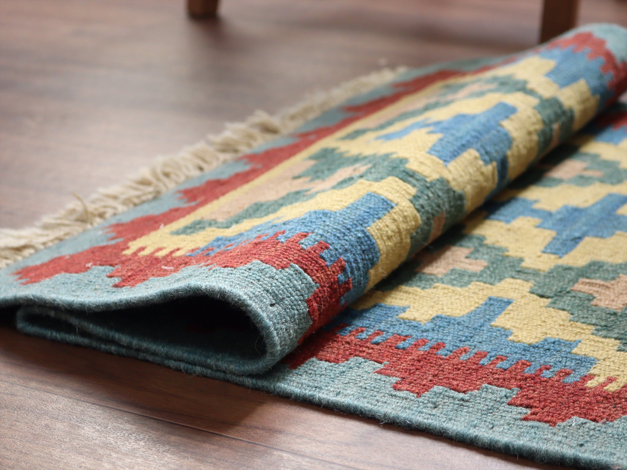 6-7mm程度の厚みがあり、パイル(毛足)がない平織りの敷物で表面は少しザラっとした肌ざわりです。織り手の自由なアイデアでデザインされていますので、左右対象でなかったり、モチーフが少しずれていたりということもありますが、世界で一枚だけの作品ですからその点はご了承ください。