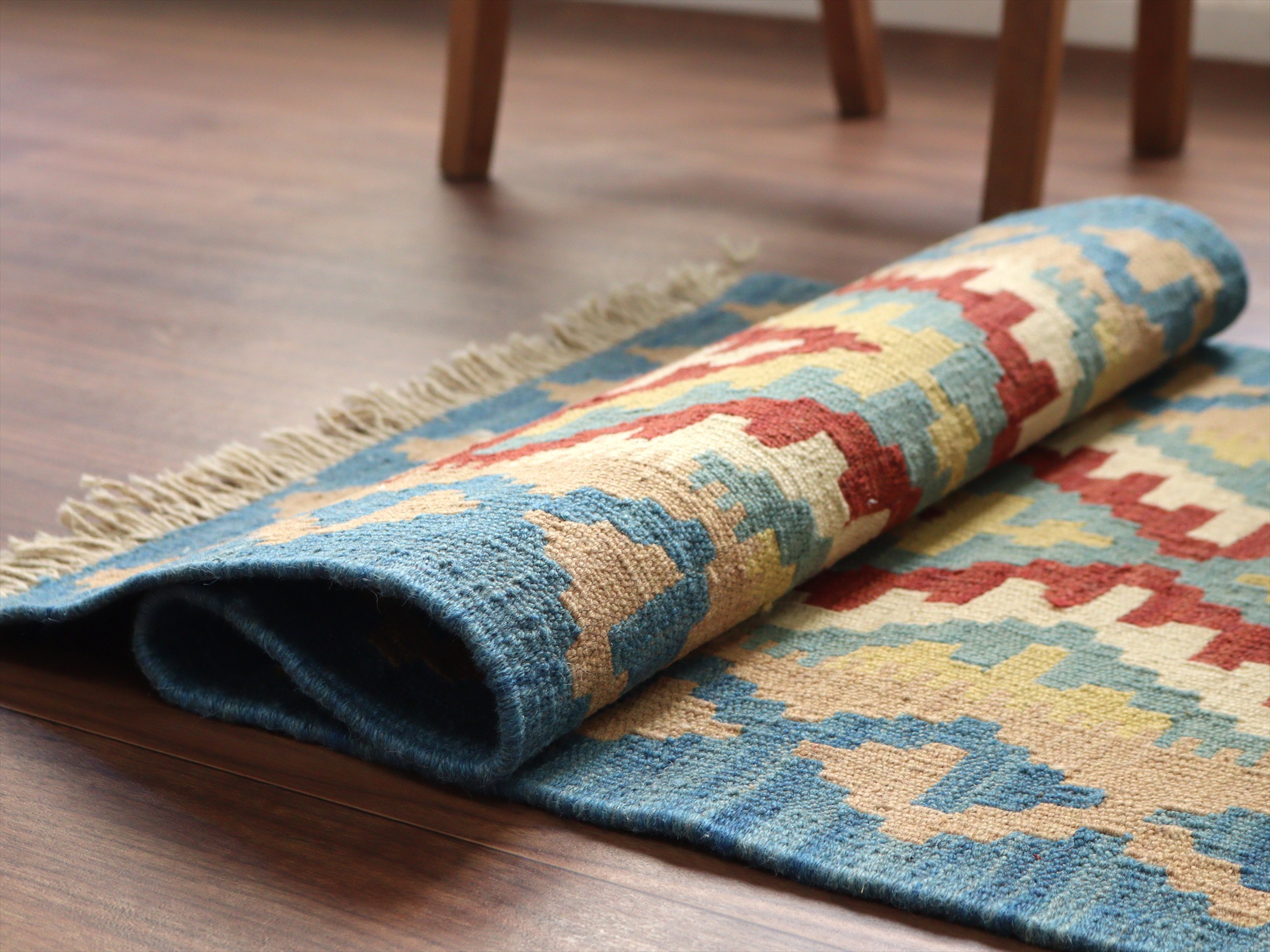 6-7mm程度の厚みがあり、パイル(毛足)がない平織りの敷物で表面は少しザラっとした肌ざわりです。織り手の自由なアイデアでデザインされていますので、左右対象でなかったり、モチーフが少しずれていたりということもありますが、世界で一枚だけの作品ですからその点はご了承ください。