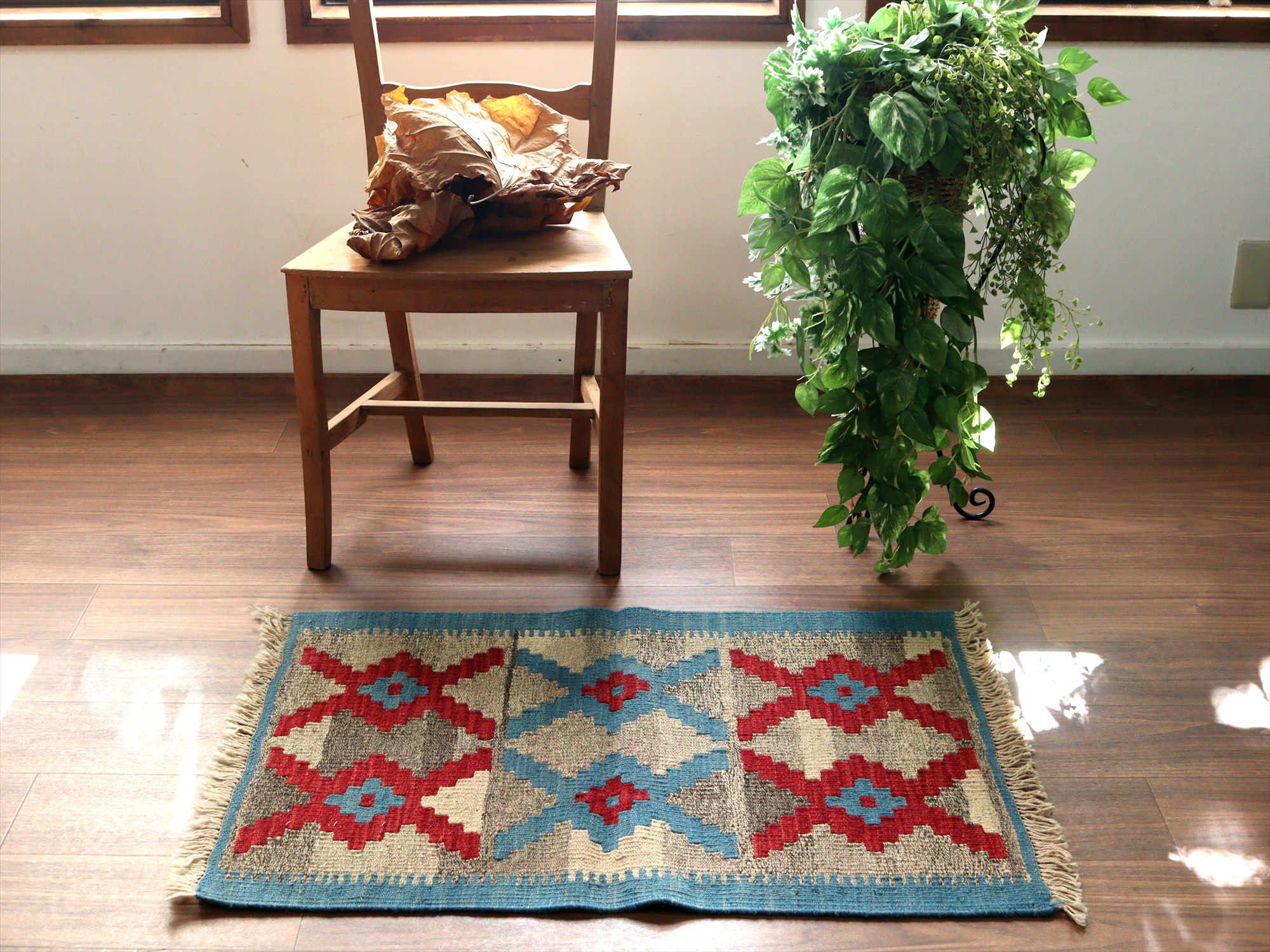 - 手織りキリム イラン シラーズ85×61cm カラフルな幾何学モチーフ